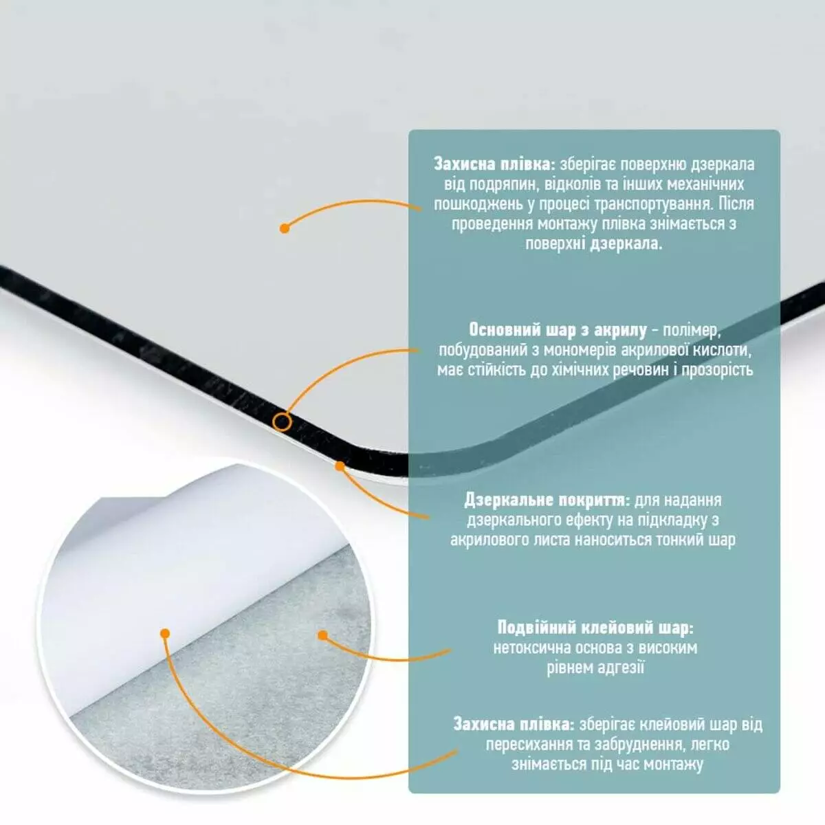Дзеркало акрилове на клейовій основіАкрилове дзеркало є легким та ударостійким декоративним метеріалом. Виготовляється з високоякісного акрилу, який забезпечує стійкість до пошкоджень. Широко застосовуються в дизайні інтер'єру, виставкових стендах, торговому обладнанні та інших областях, де важливі легкість та безпека матеріалу.