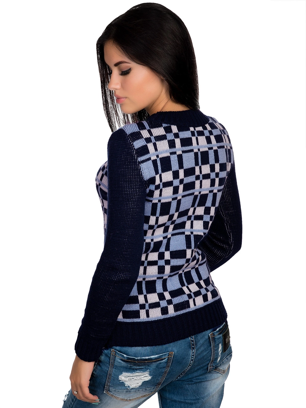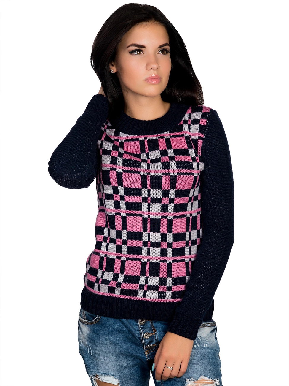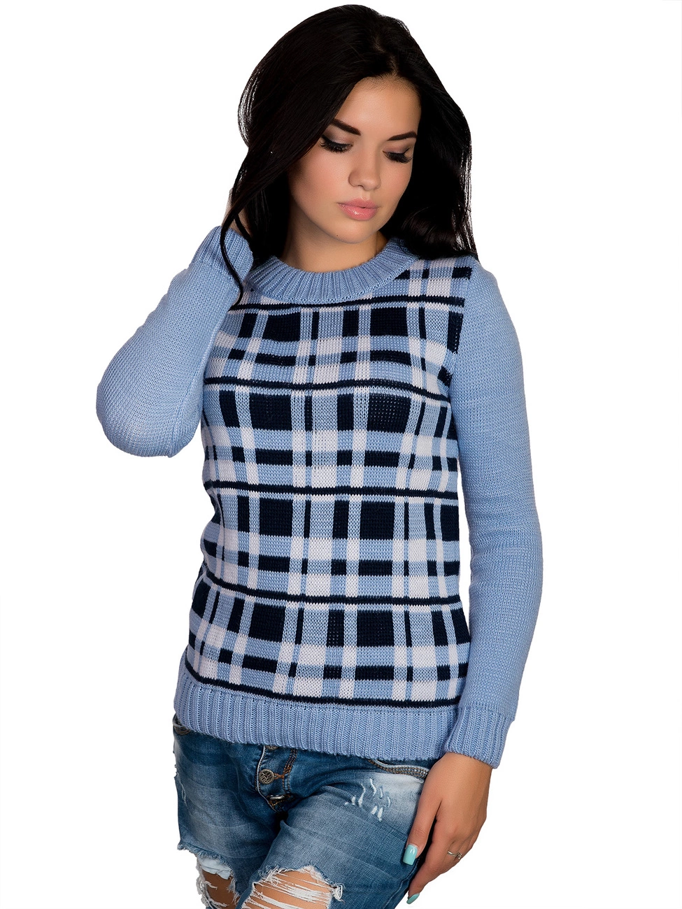 Стильный, теплый джемпер прямого силуэта, выполненный плотной жаккардовой вязкой, оформленный жаккардовым рисунком в виде мелкой клетки. Круглая горловина, длинный рукав и низ изделия оформлены вязкой-резинкой. Комфортный, мягкий джемпер окутает Вас теплом.