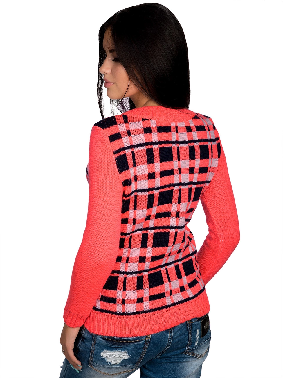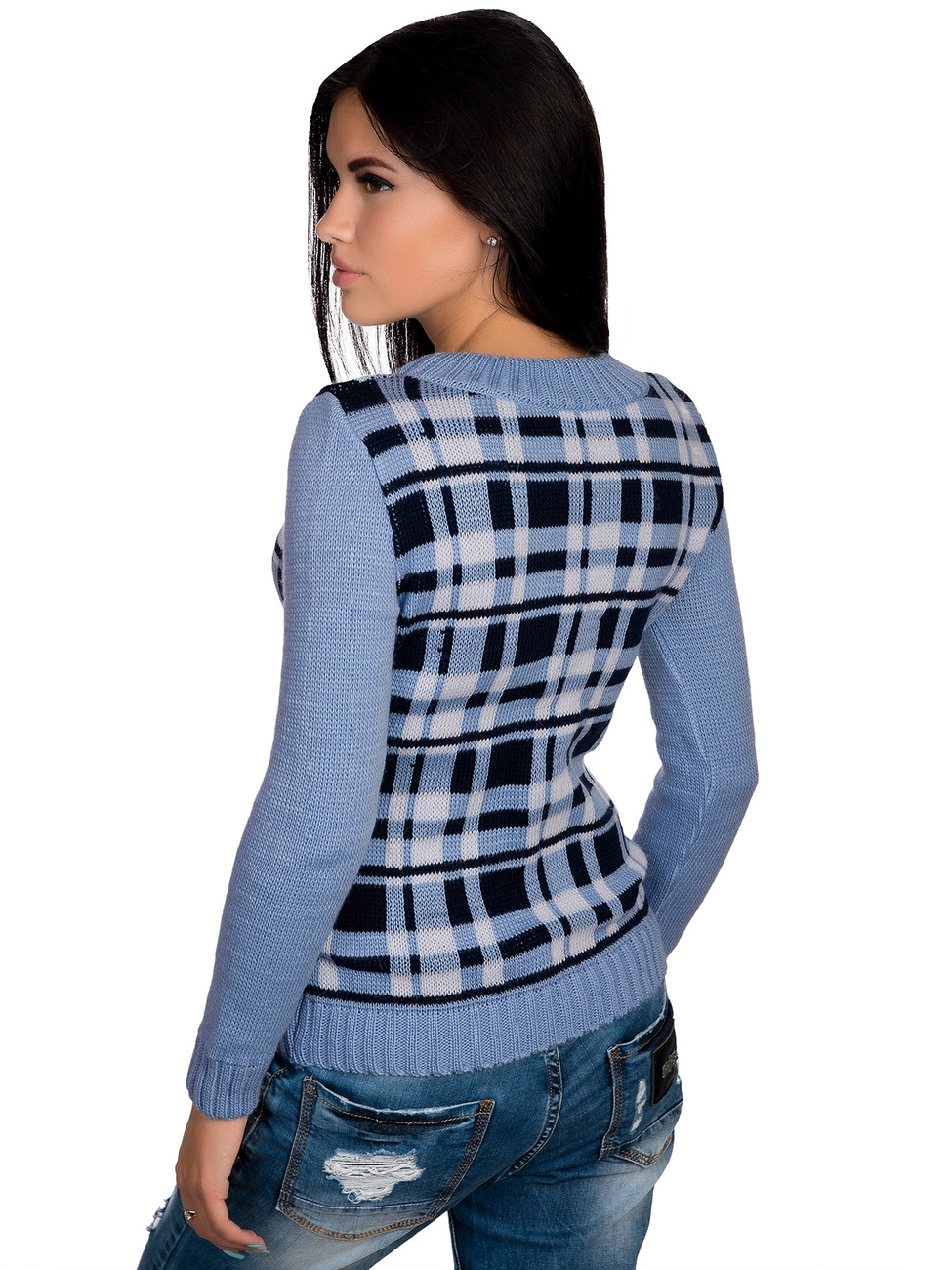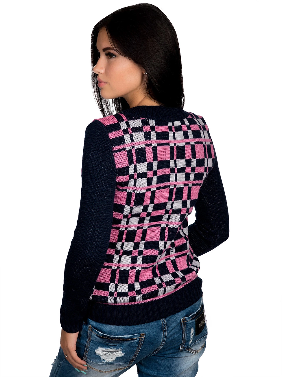 Стильный, теплый джемпер прямого силуэта, выполненный плотной жаккардовой вязкой, оформленный жаккардовым рисунком в виде мелкой клетки. Круглая горловина, длинный рукав и низ изделия оформлены вязкой-резинкой. Комфортный, мягкий джемпер окутает Вас теплом.