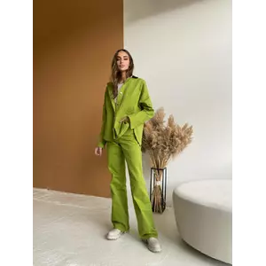 Сорочка подовжена та має дві накладні кишені, застібається на ґудзики, штани прямого крою та високої посадки.