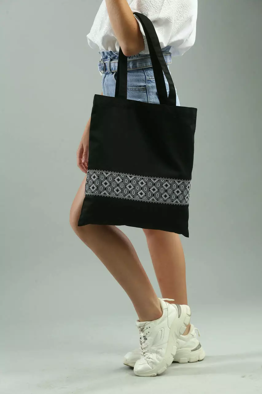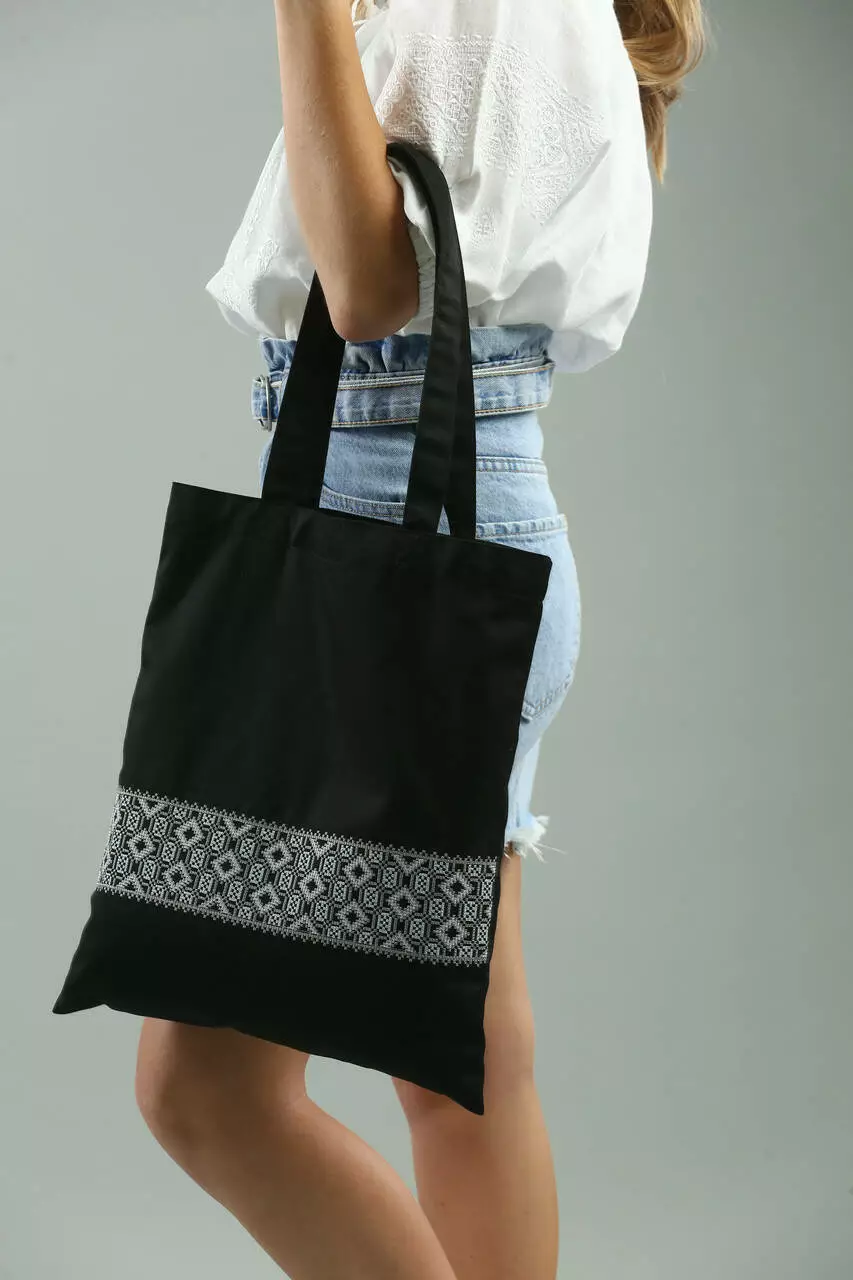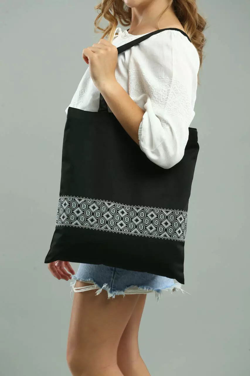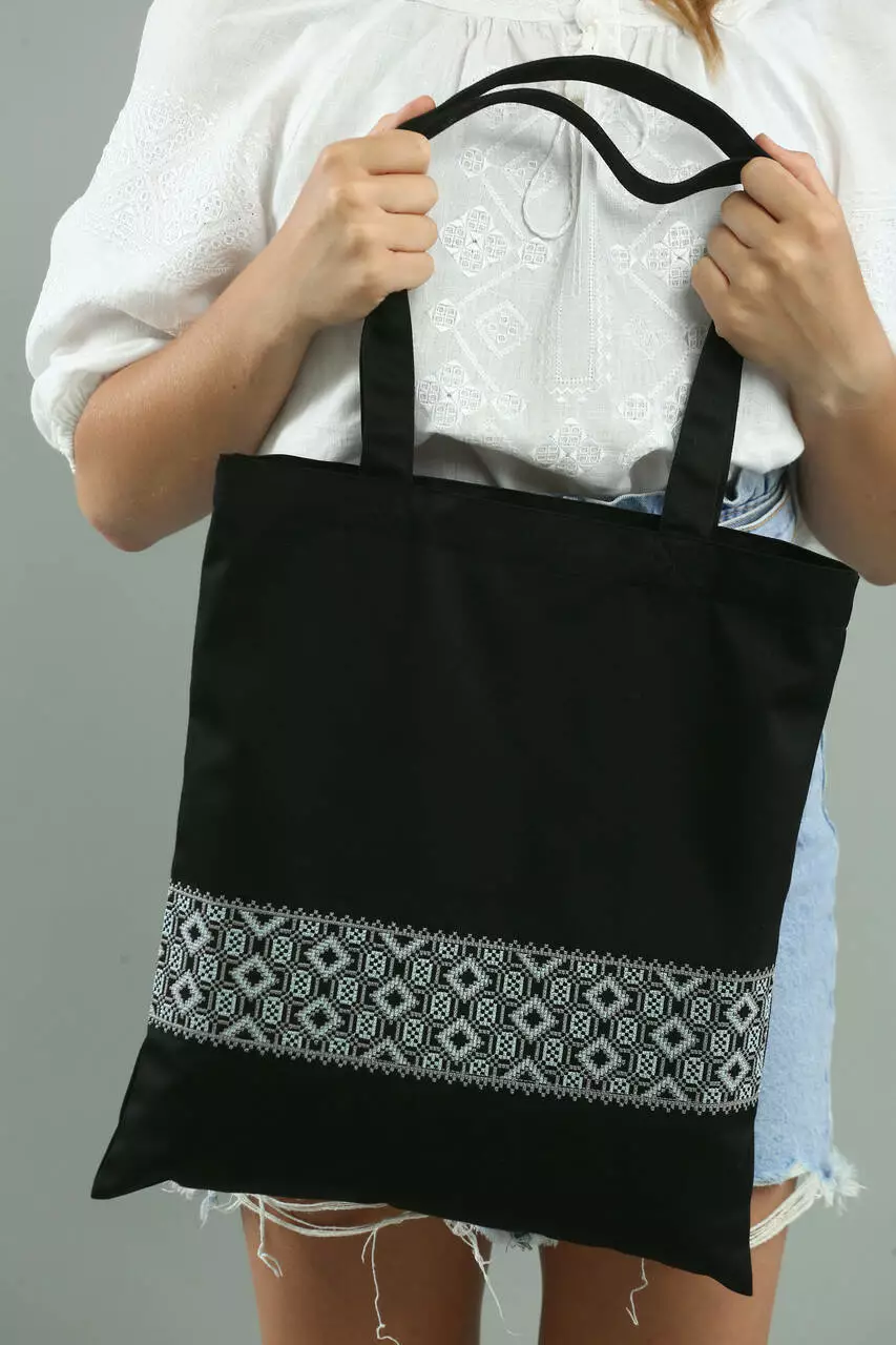 Сумка шопер в етно-стилі з об’ємним геометричним орнаментом. Екстраординарна і оригінальна – вона створює цікавий акцент в образі, що все більше вітаються в сучасній моді. Така модель підійде для використання на кожен день, а чорний колір додає максимальної практичності.
