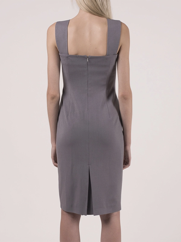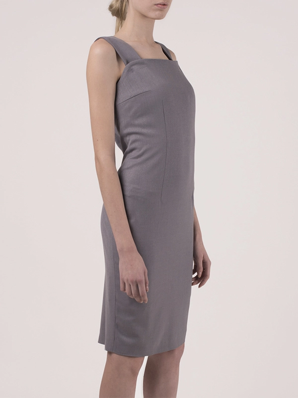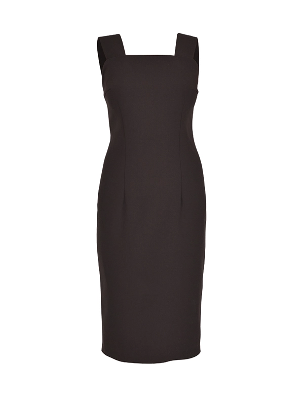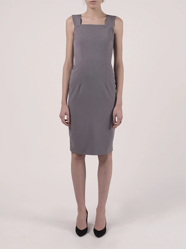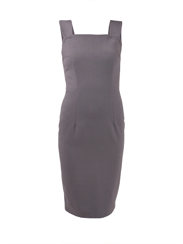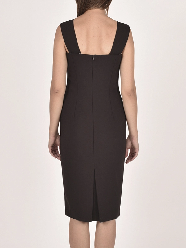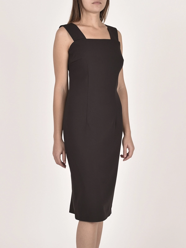 Элегентное платье-футляр на подкладе. Съемные широкие бретели. Сзади широкая складка. Длина ниже колена, заужено.