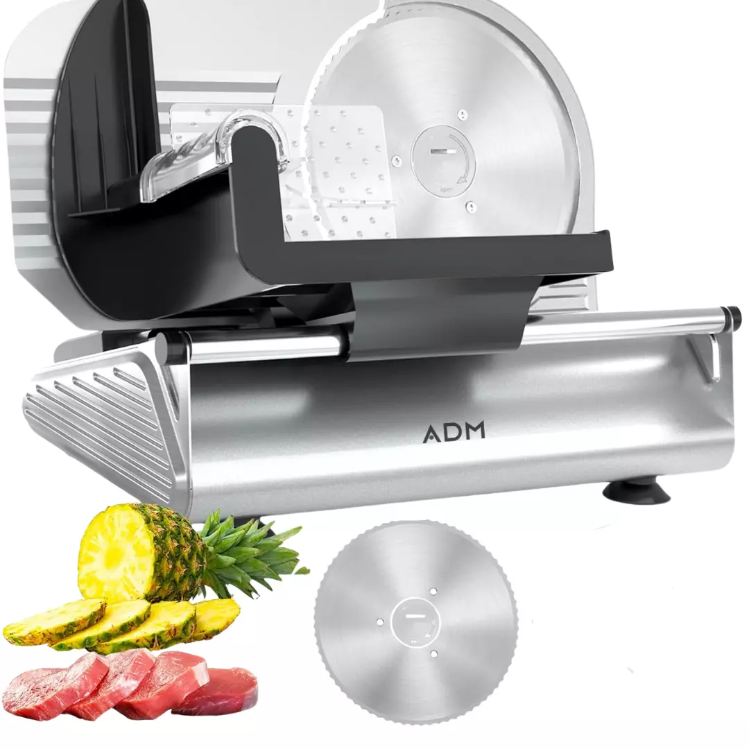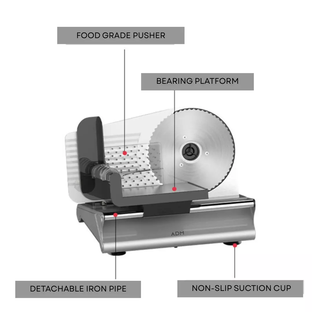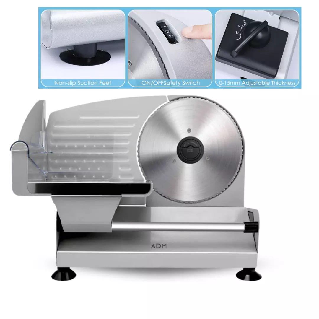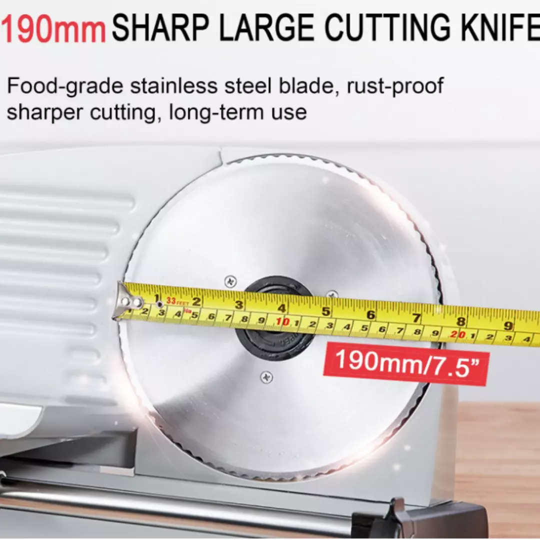 М'ясорізка : виготовлена з високоякісним лезом з нержавіючої сталі та мідним двигуном для чистого та безшумного нарізання широкого спектру продуктів