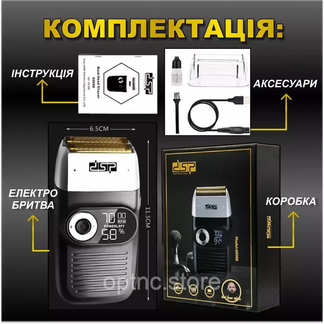 Электробритва DSP 5W;<br />; Защитная крышка; кабель для подзарядки USB;<br />; Щёточка для чистки;<br />; Масло для смазывания;<