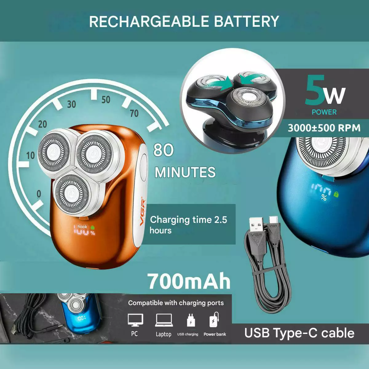 Сучасна акумуляторна електробритва VGR V-346 – це зручне рішення для щоденного догляду за собою. Роторна система з трьома плаваючими головками забезпечує чисте та комфортне гоління, точно повторюючи контури обличчя. Модель підходить як для сухого, так і для вологого гоління, а вологозахищений корпус дозволяє легко промивати пристрій під водою.