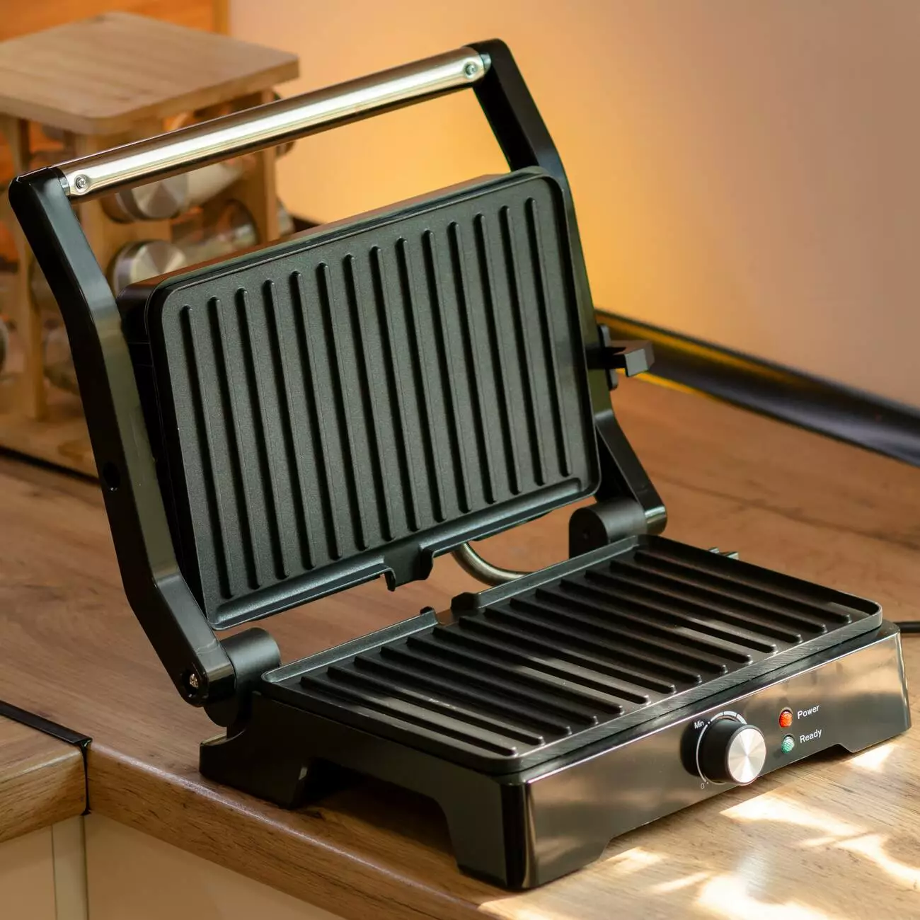 Пристрій оснащений панелями з антипригарним покриттям, ребриста поверхня забезпечує стікання жиру в лоток, в результаті чого страви виходять більш здоровими та низькокалорійними.