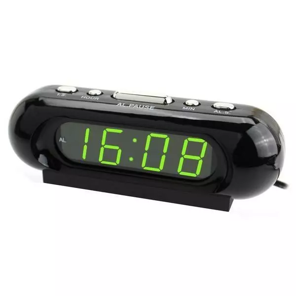 Электронный будильник показывает индексацию времени в 24 часовом формате. Прибор имеет универсальный характер использования дома и в офисе. В любой интерьер устройство впишется прекрасно. Благодаря возможности программировать будильник, вы сможете просыпаться под приятную, любимую вами мелодию. Существует функция повторного срабатывания будильника, устройство ставится на ПАУЗУ. Светодиоды зеленого цвета ярко освещают цифры на дисплее. Видимость светодиодов одинаково яркая в любое время суток. Кнопки управления часами расположены на верхней панели, это обеспечивает комфортность эксплуатации прибора.