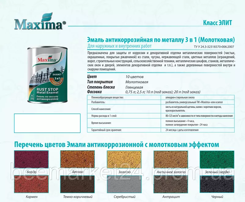 Являє собою емаль для металу 3в1, яка функціонально поєднує в собі: