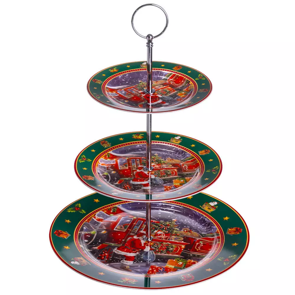 Елегантна триярусна етажерка з порцеляни - ідеальна прикраса для святкового столу та стильна підставка для десертів, печива та цукерок. Етажерка виконана із використанням різдвяних мотивів, що допомагає створювати атмосферу свята.