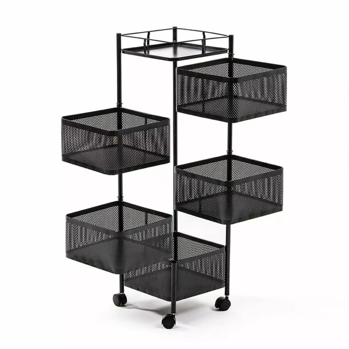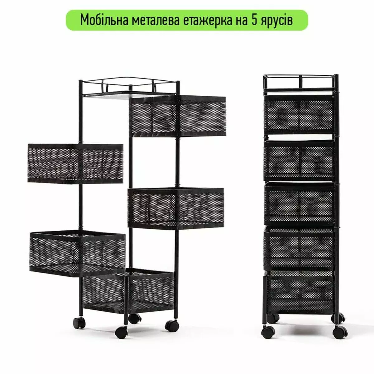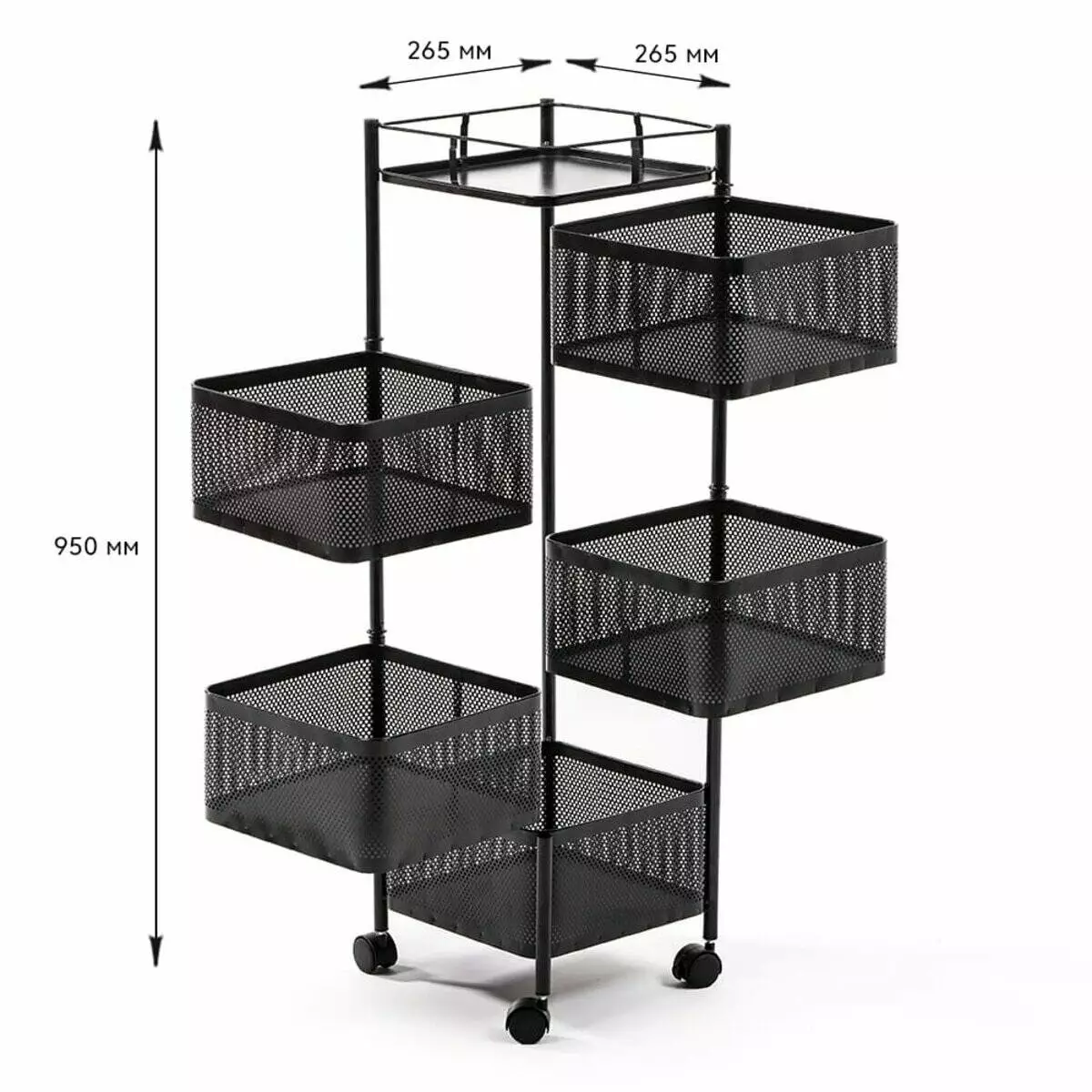 Підлогова металева етажерка - це багаторівнева конструкція з п'ятьма кошиками однакового розміру, виконаними з перфорованої сталі з порошковим покриттям. Конструкція оснащена коліщатками, що забезпечує легкість переміщення приміщення. Верхні яруси можуть змінювати положення, дозволяючи адаптувати етажерку під різні потреби.