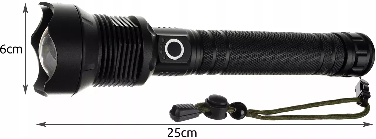 • СПЕЦИФИКАЦИИ - материал: алюминий; дальность свечения: 500 м; светодиод P70; 3 режима освещения; аккумулятор: 2 x 6800 мАч; мощность: 4500 люмен; габариты: 25 x 6 см; вес: 0,504 кг; вес упаковки: 0,700 кг.