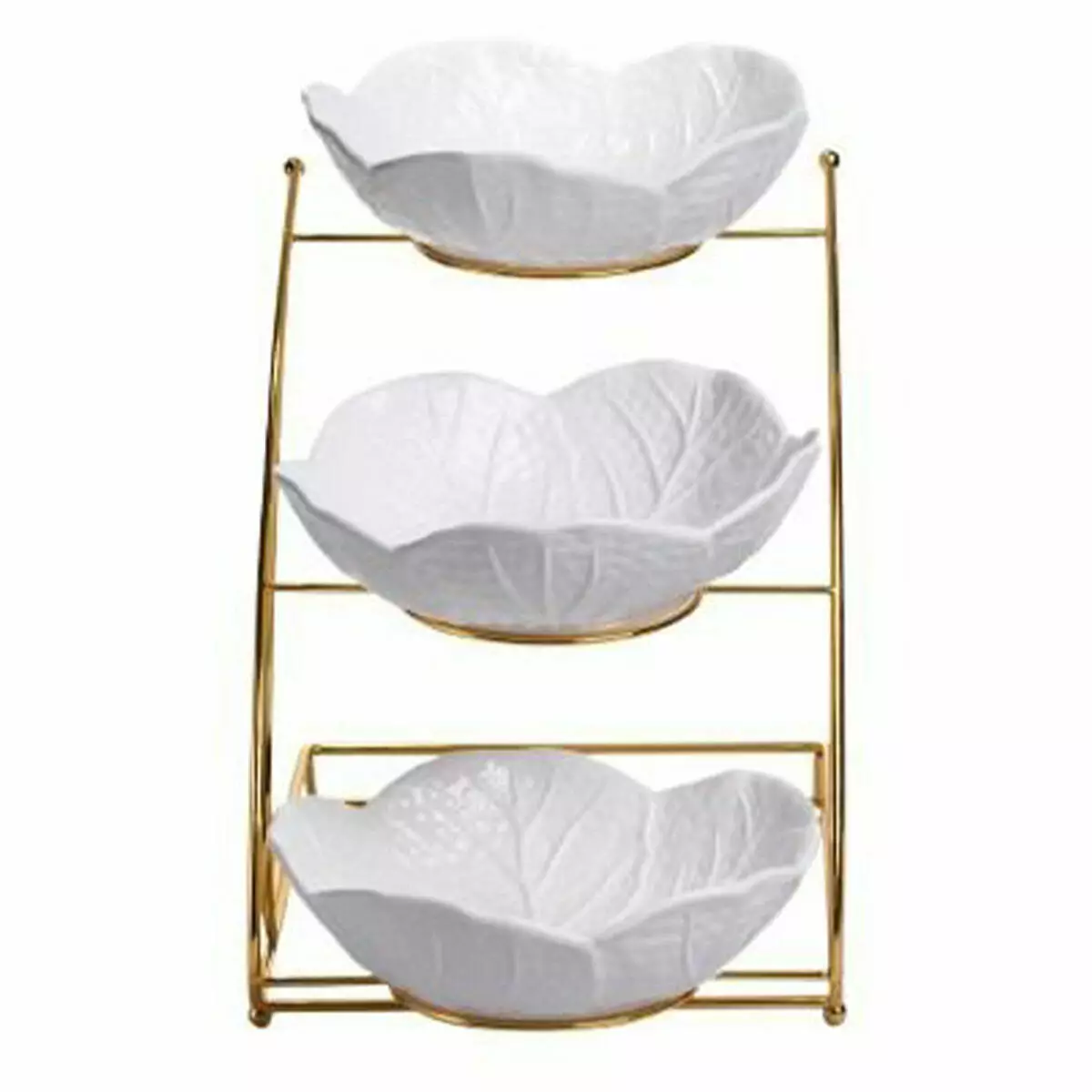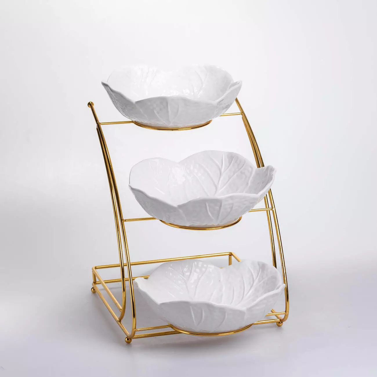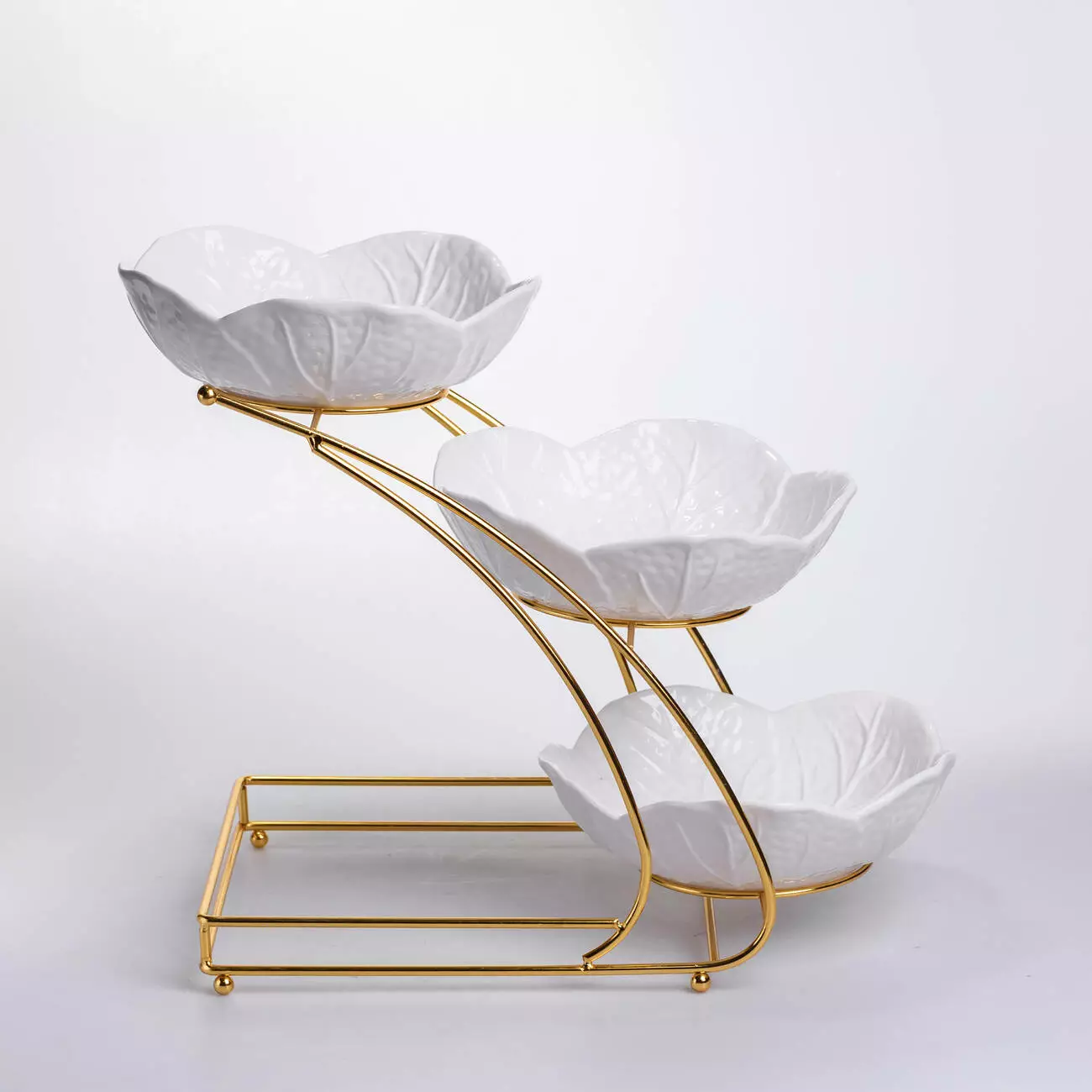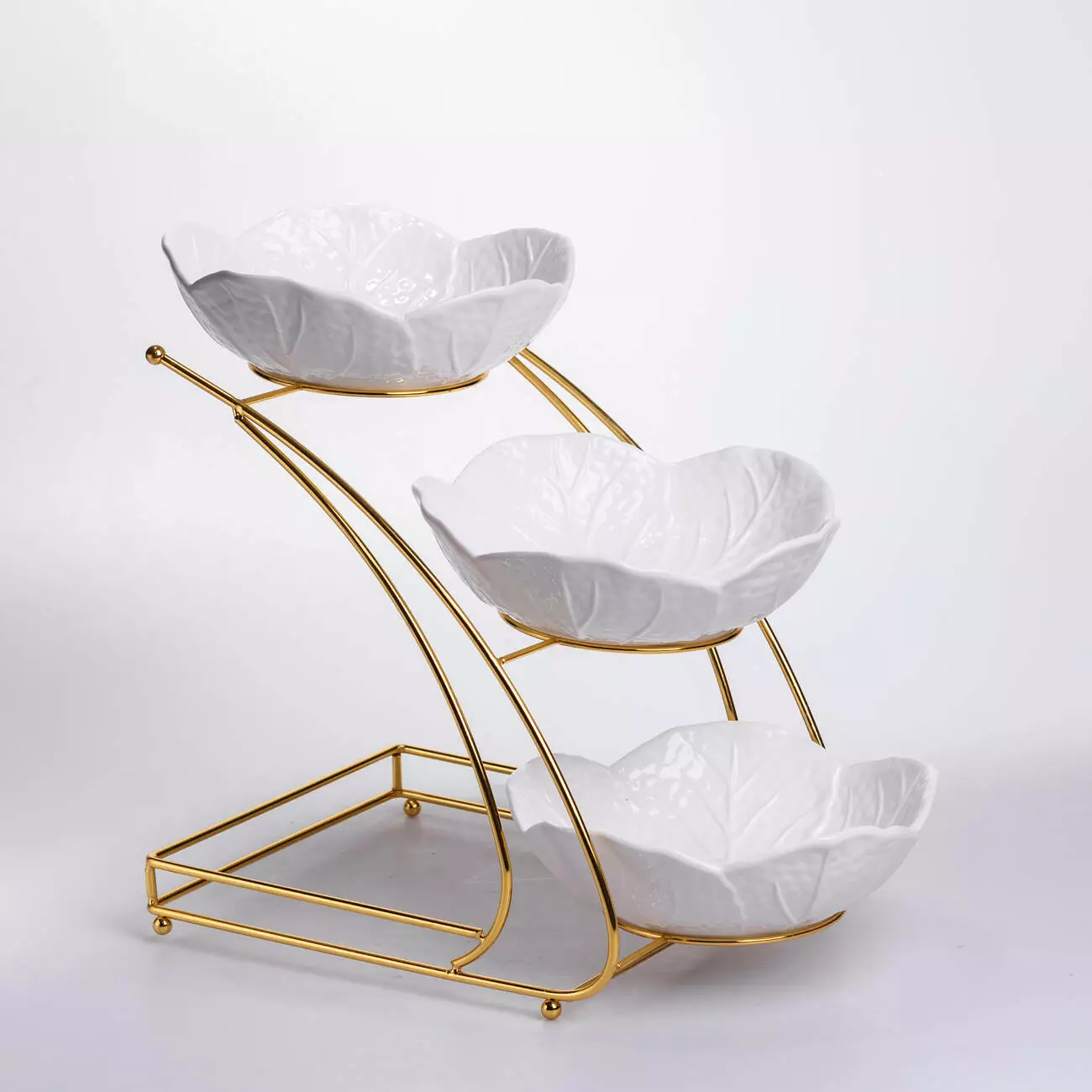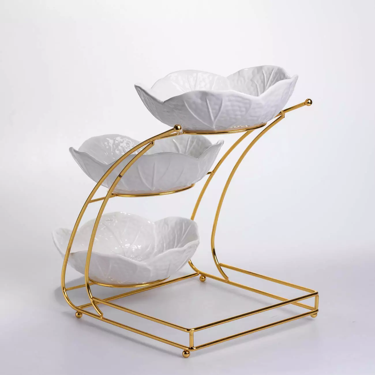 Фруктовниця на три яруси виконана з порцеляни та встановлена на металеву підставку золотистого кольору. Вона поєднує функціональність і гарний зовнішній вигляд, дозволяючи сервірувати фрукти, солодощі чи закуски у зручному форматі. Кожна чаша має форму пелюстки, що створює ніжний та естетичний вигляд, гармонійно поєднуючись із будь-яким стилем сервірування.