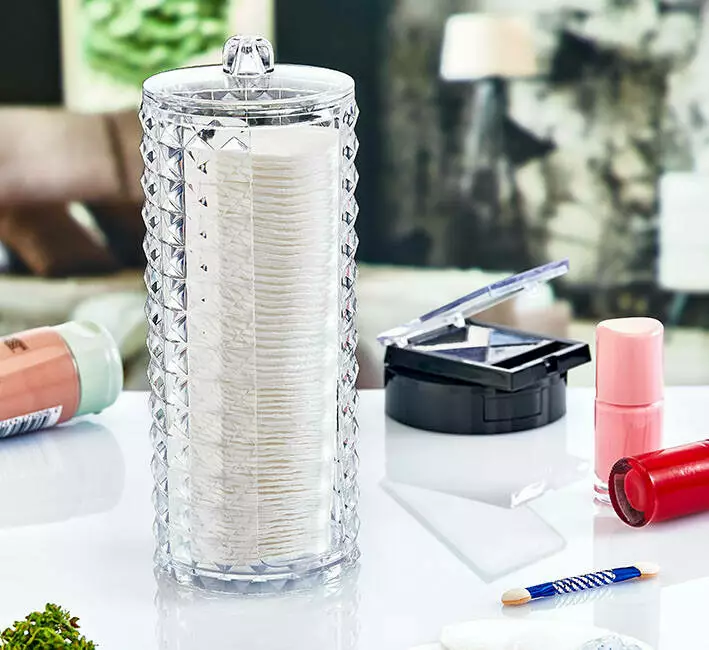 Через те, що ватяні диски зберігаються в упаковці, ви часто не можете їх дістати або розсипаєте? Великий циліндр Diamond бренду BoxUp, зробить все, щоб навести лад на туалетному столику або полиці у ванній! Зручний аксесуар вміщує достатню кількість ватних дисків, даючи змогу контролювати їхню витрату за рахунок прозорого матеріалу виготовлення. Виріб чудово впишеться у будь-який інтер'єр, адже його дизайн простий та універсальний. З ним ваші засоби особистої гігієни будуть у цілості, чистоті та безпеці.