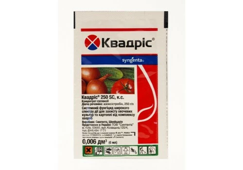 Квадрис - фунгицид широкого спектра действия используют для защиты овощей от всех основных болезней мучнистой росы, фитофтороза, макроспориоза, ложной мучнистой росы, пятнистости и др. Имеет лечебное, системное, искореняющее, профилактическое действие и трансламинарное свойство. Уничтожает возбудителя болезни во время инкубационного периода, дает возможность остановить распространение и развитие инфекции на участке.