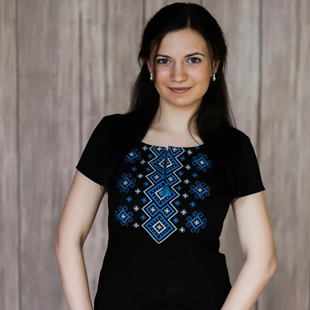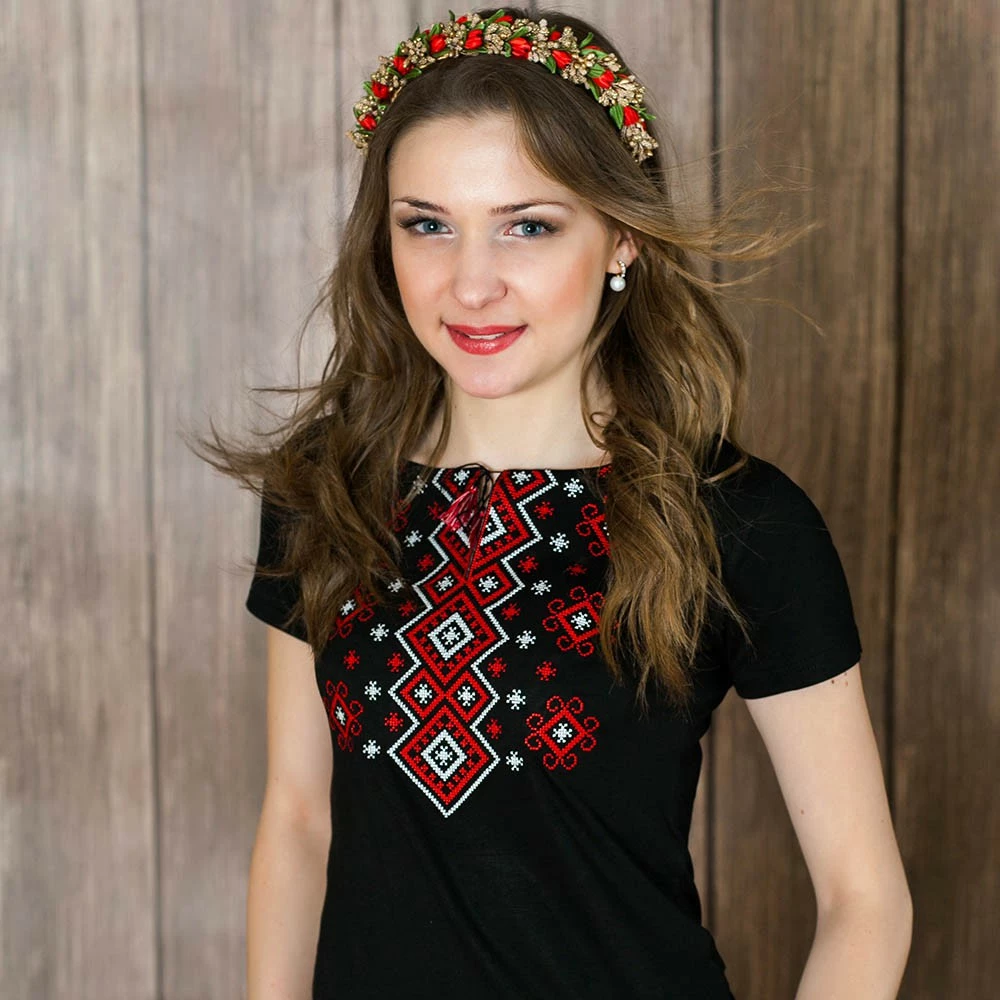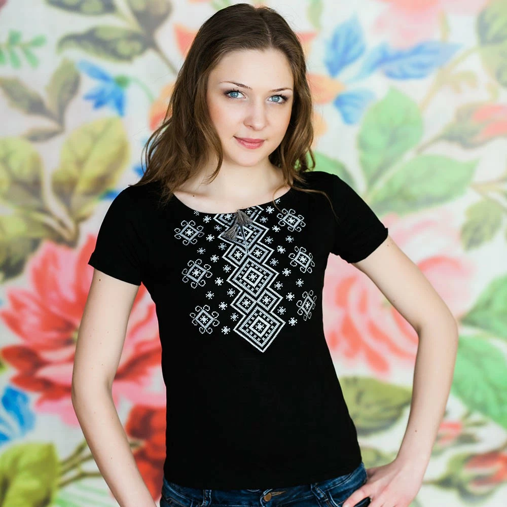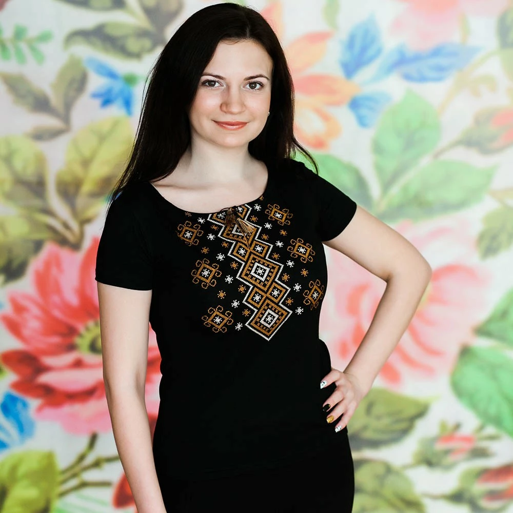 Жіноча вишита футболка оздоблена яскравим широким