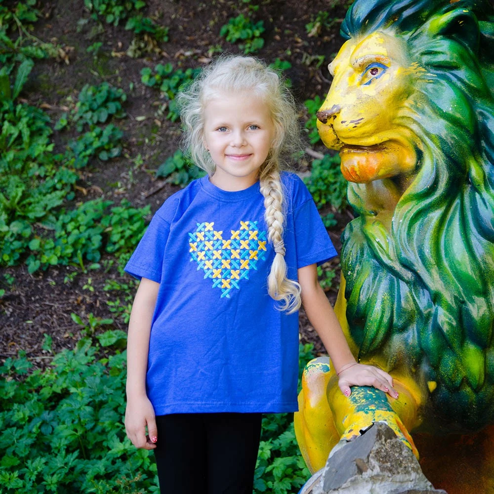 Дитяча футболка із вишитим патріотичним серцем на кольровому тлі від гуртівні Leosouvenir чудово пасуватиме Вашій малечі.