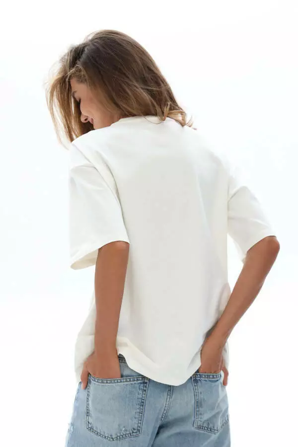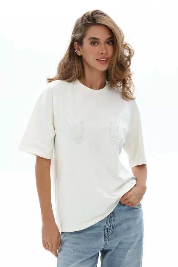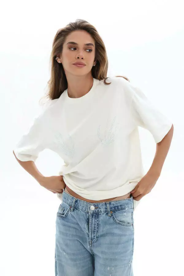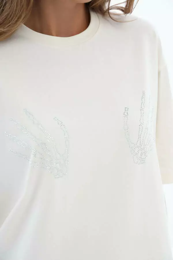Це великомірна жіноча базова футболка оверсайз з аплікацією зі стразів — стильний та універсальний елемент гардероба на кожен день. Свободний крій гарантує комфорт і свободу рухів, а м’який бавовняний трикотаж приємний до тіла і добре пропускає повітря. Яскрава аплікація зі стразів додає образу оригінальності і легкої глянцевої нотки, що робить цю модель ідеальною для щоденного носіння та для створення більш виразних луків. Завдяки мінімалістичному дизайну її легко поєднувати з джинсами, шортами, спідницями чи жакетами для створення сучасного стильного образу у стилі casual чи smart-casual.