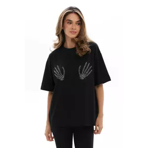 Це великомірна жіноча базова футболка оверсайз з аплікацією зі стразів — стильний та універсальний елемент гардероба на кожен день. Свободний крій гарантує комфорт і свободу рухів, а м’який бавовняний трикотаж приємний до тіла і добре пропускає повітря. Яскрава аплікація зі стразів додає образу оригінальності і легкої глянцевої нотки, що робить цю модель ідеальною для щоденного носіння та для створення більш виразних луків. Завдяки мінімалістичному дизайну її легко поєднувати з джинсами, шортами, спідницями чи жакетами для створення сучасного стильного образу у стилі casual чи smart-casual.