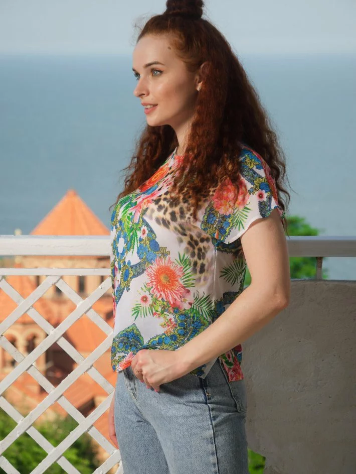 Блузка - футболка з шифону, застібка ззаду на ґудзичок.