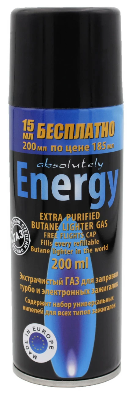 Газ для заправки зажигалок бытовых и карманных. В балоне 200 мл. Габариты изделия 17х5 см. Произведено в Турции.