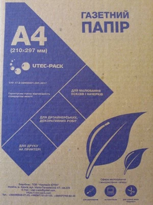 Газетная бумага, Плотность 45 г/м2 , формат А4 , упаковка 300 листов