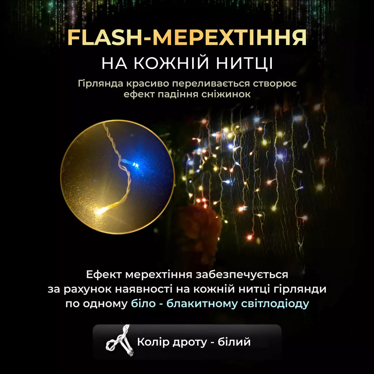 Гірлянда «Бахрома» з 840 LED лампочками створює атмосферне освітлення для зовнішнього або внутрішнього декору. Довжина основного шнура становить 50 метрів, що дозволяє прикрашати фасади будинків, вікна, балкони, альтанки чи вітрини. Завдяки білій нитці гірлянда непомітна вдень і виглядає акуратно при монтажі, а в темний час доби рівномірно розсіює світло, створюючи святкову ілюмінацію.