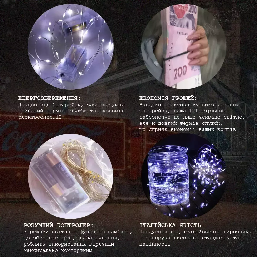 • Экономия денег: Благодаря эффективному использованию батареек, наша LED-гирлянда обеспечивает не только яркий свет, но и долгий срок службы, что способствует экономии ваших средств