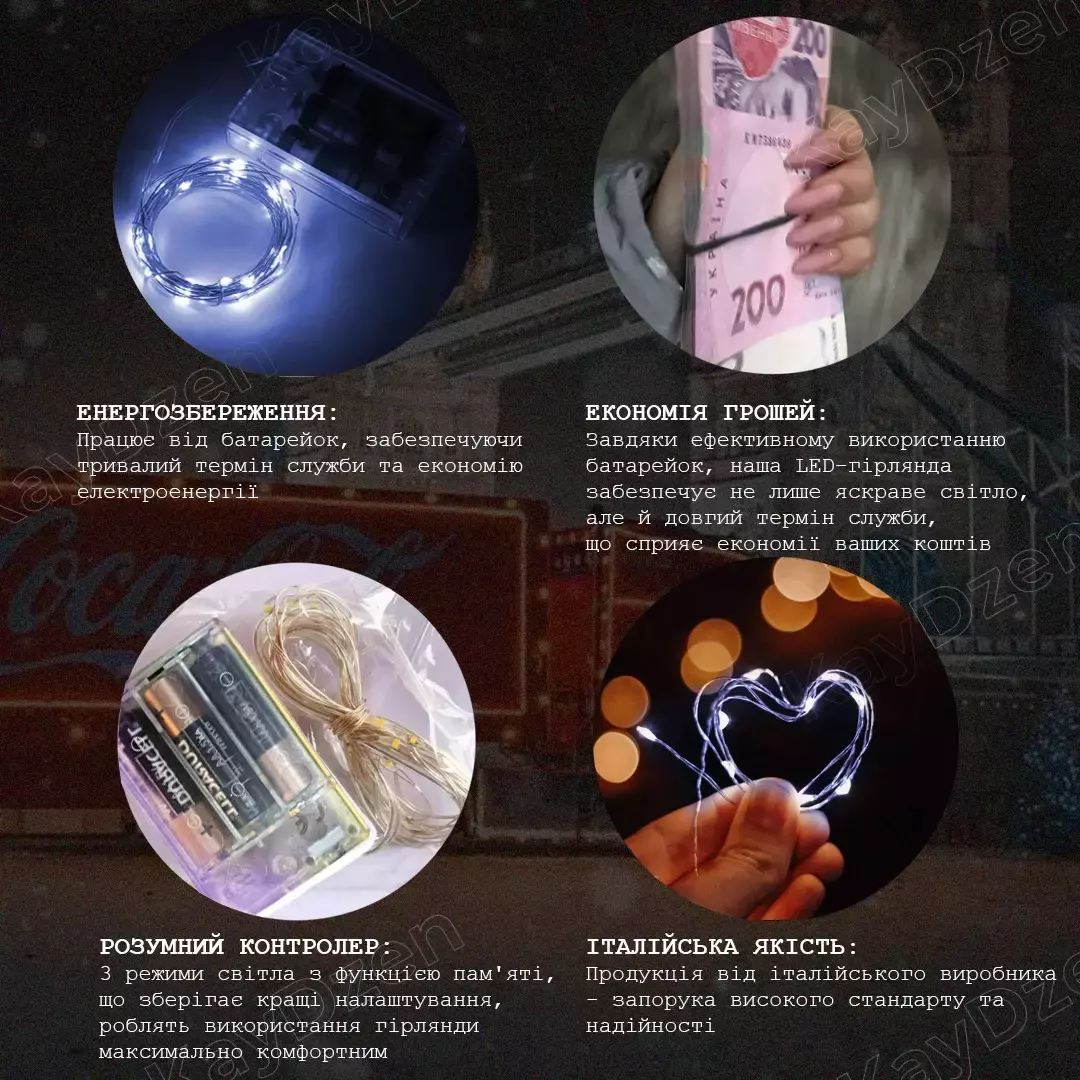 • Экономия денег: Благодаря эффективному использованию батареек, наша LED-гирлянда обеспечивает не только яркий свет, но и долгий срок службы, что способствует экономии ваших средств