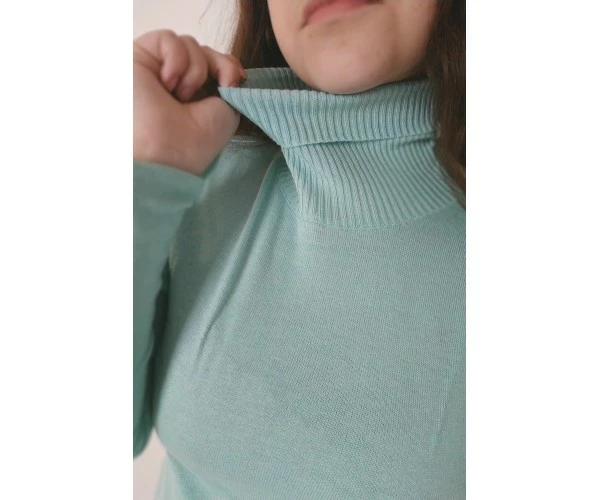 Однотонный джемпер с воротником мятного цвета добавит яркий штрих к любому образу. Оригинальность модели придает боковой разрез и пуговицы
