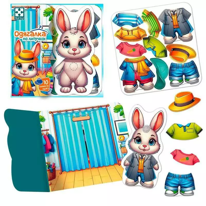 гр Гра з липучками "Зайчик" VT1320-04 (90) "Vladi Toys", фігурка тваринки, 10 предметів одягу, ігровий фон
