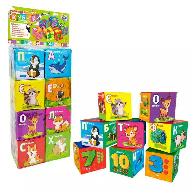 гр Кубики 40413 (36/2) "4FUN Game Club", "Тварини", 8 штук, м`які, водонепроникна тканина, літери, геометричні фігури, в пакеті
