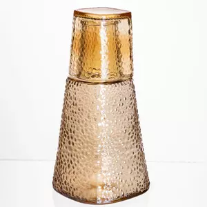 Карафе зі склянкою – стильний та практичний набір для води та напоїв. Прозорий графин із фактурними гранями зручно тримати в руці, а склянка служить не лише посудом для пиття, а й кришкою, що надійно захищає вміст. Посуд виконаний зі скла з виразною молоточковою текстурою, яка не лише надає виробу декоративного об'єму, а й гарно заломлює світло. Крім того, така поверхня набагато менш марка: вона ефективно приховує відбитки пальців та сліди від крапель, зберігаючи акуратний вигляд навіть за активного використання.