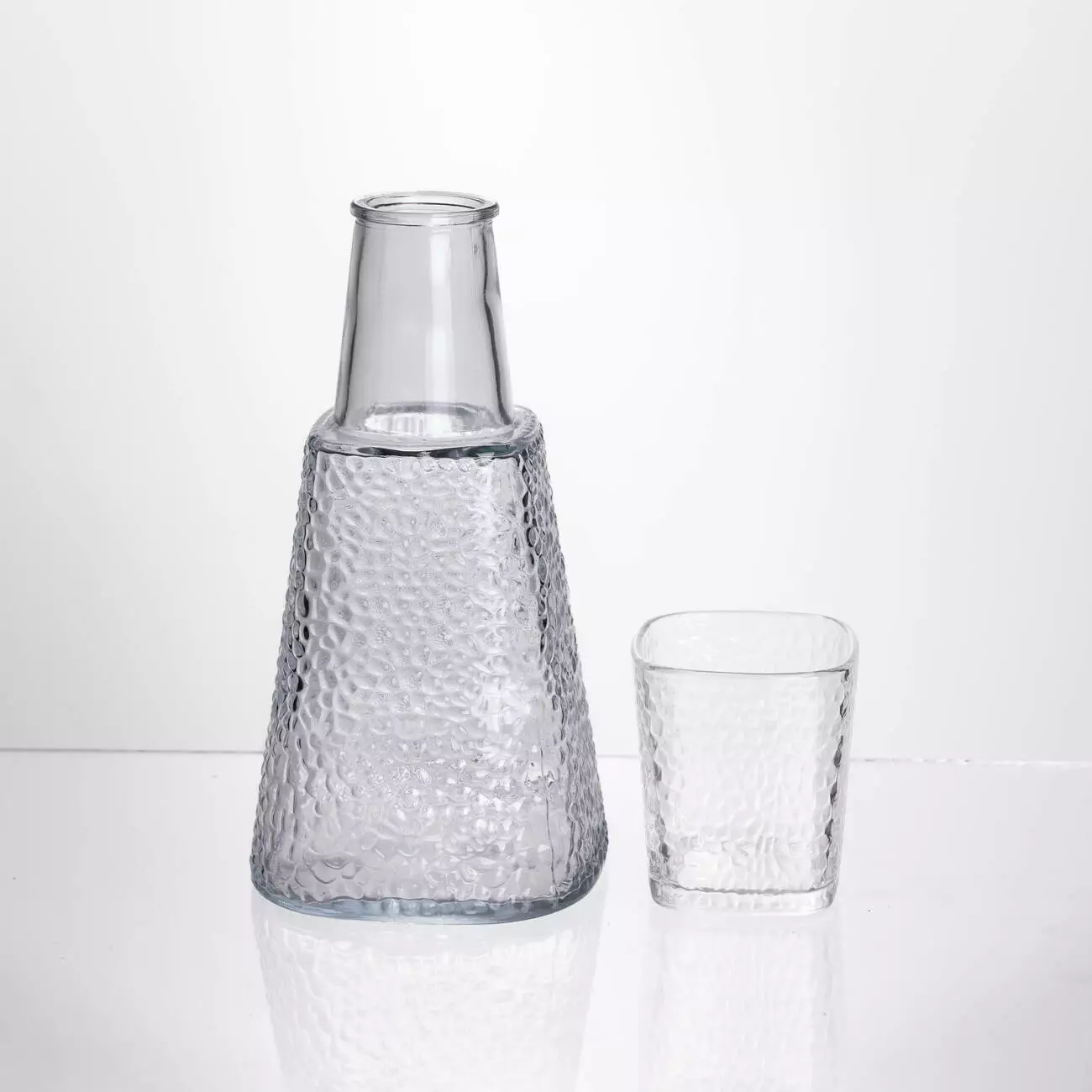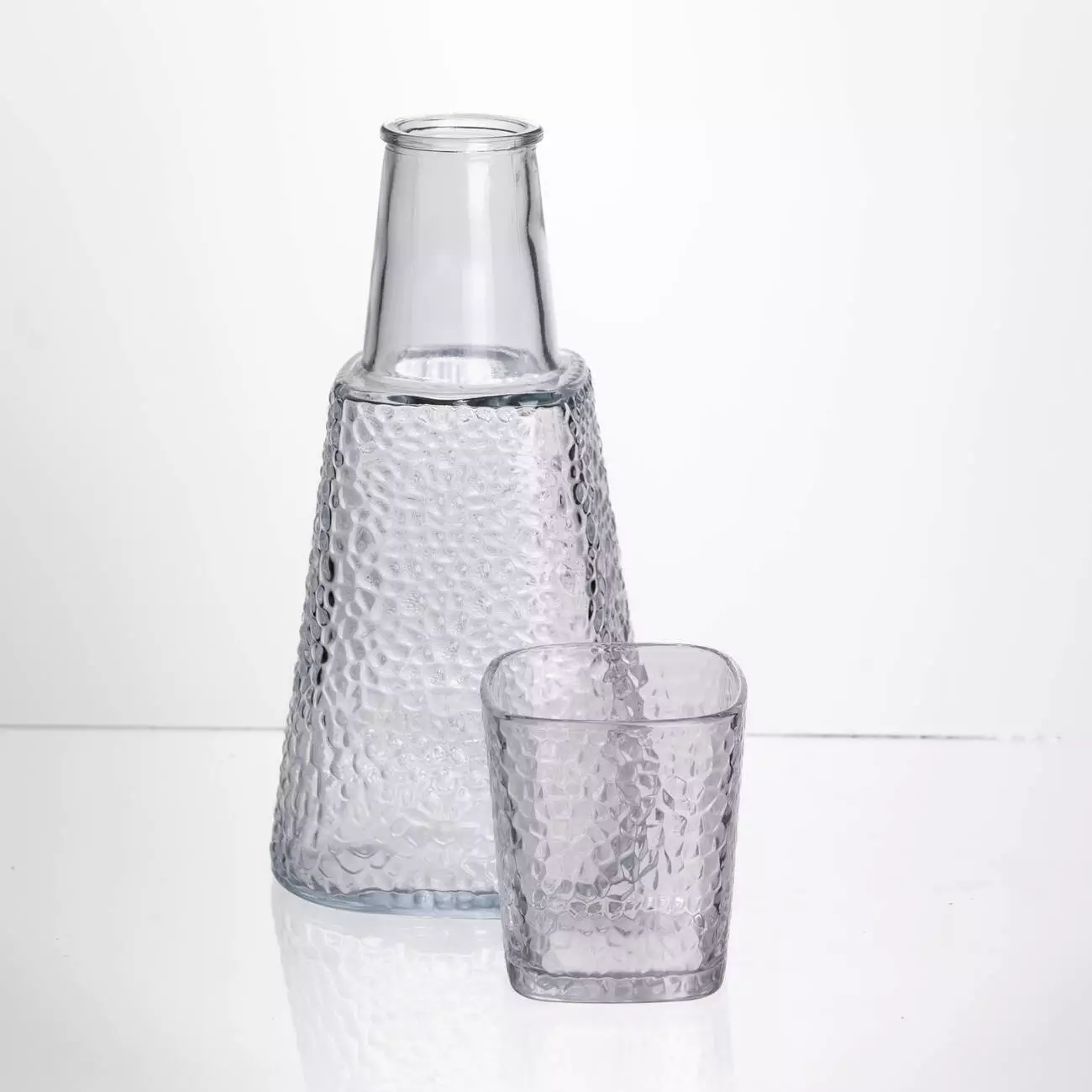 Карафе зі склянкою – стильний та практичний набір для води та напоїв. Прозорий графин із фактурними гранями зручно тримати в руці, а склянка служить не лише посудом для пиття, а й кришкою, що надійно захищає вміст. Посуд виконаний зі скла з виразною молоточковою текстурою, яка не лише надає виробу декоративного об'єму, а й гарно заломлює світло. Крім того, така поверхня набагато менш марка: вона ефективно приховує відбитки пальців та сліди від крапель, зберігаючи акуратний вигляд навіть за активного використання.