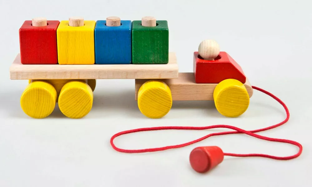 Большой деревянный грузовик на веревочке порадует любого ребенка.