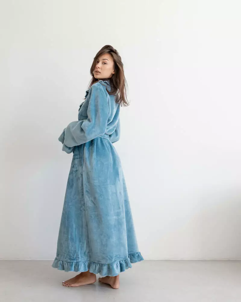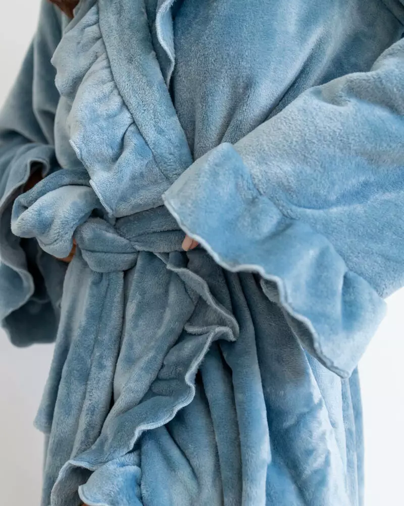 Халат із якісної плюшевої махри, дуже приємний та мякий, не викликає подразнень на тілі. Ви зможете загорнутися в нього прохолодним ранком або відразу ж після ванни, щоб зберегти тепло. Халат просто незамінний для дому, якщо ви хочете відчувати комфорт. Він прекрашений рюшами на рукавах та по краю всього виробу. -Тканина екологічна, гіпоаллергена, приємна на дотик, придатна для повсякденного носіння; -Халат на запах, з кишенями, є пояс; -Зручний крій, що не сковує рухів; -Не деформується, не линяє, не кашлатиться.