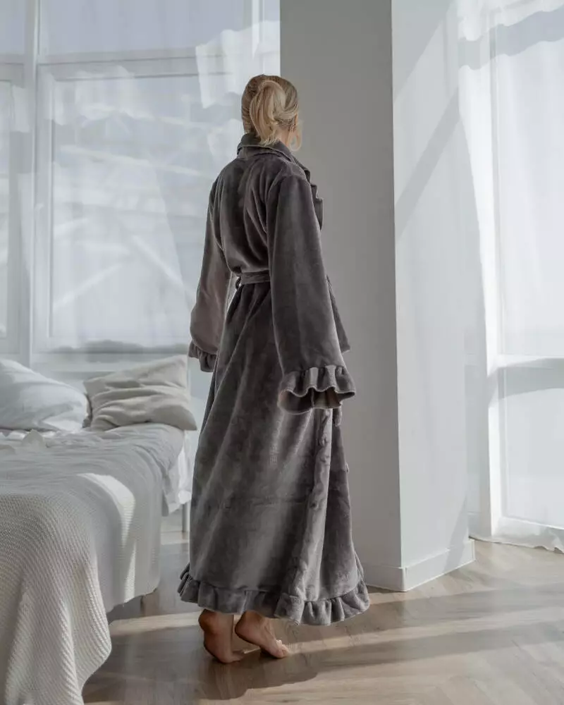 Халат із якісної плюшевої махри, дуже приємний та мякий, не викликає подразнень на тілі. Ви зможете загорнутися в нього прохолодним ранком або відразу ж після ванни, щоб зберегти тепло. Халат просто незамінний для дому, якщо ви хочете відчувати комфорт. Він прекрашений рюшами на рукавах та по краю всього виробу. -Тканина екологічна, гіпоаллергена, приємна на дотик, придатна для повсякденного носіння; -Халат на запах, з кишенями, є пояс; -Зручний крій, що не сковує рухів; -Не деформується, не линяє, не кашлатиться.