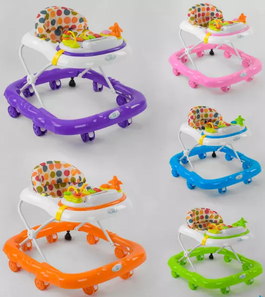 Дитячі ходунки JOY Н 28 із музичною ігровою панеллю призначені для малюків 6-18 місяців. Ходунки мають 3 положення регулювання по висоті та легко складаються для зручного зберігання та подорожей. М'який бампер захищає меблі від пошкоджень під час переміщення ходунків. Ходунки оснащені 8-ма парами здвоєних поворотних коліс із пластику. Також, в комплекті передбачено два гальма (фіксатори положення). Знімна інтерактивна панель включає рухливі ігрові елементи і 4-е музичні кнопки. При натисканні на кнопки звучать веселі пісеньки. Кожній кнопці відповідає своя пісня (озвучення російською мовою). Характеристики ходунків Н 28: - Сидіння знімається для прання. - Діаметр коліс: d=6,5см. - Мінімальна висота від підлоги: 38 см. - максимальна висота від підлоги: 45 см. - максимальне навантаження: 15 кг. - Музична панель працює від 2-х батарей типу «АА» 1.5V (не входять в комплект). - Матеріал: пластик, метал, тканина.