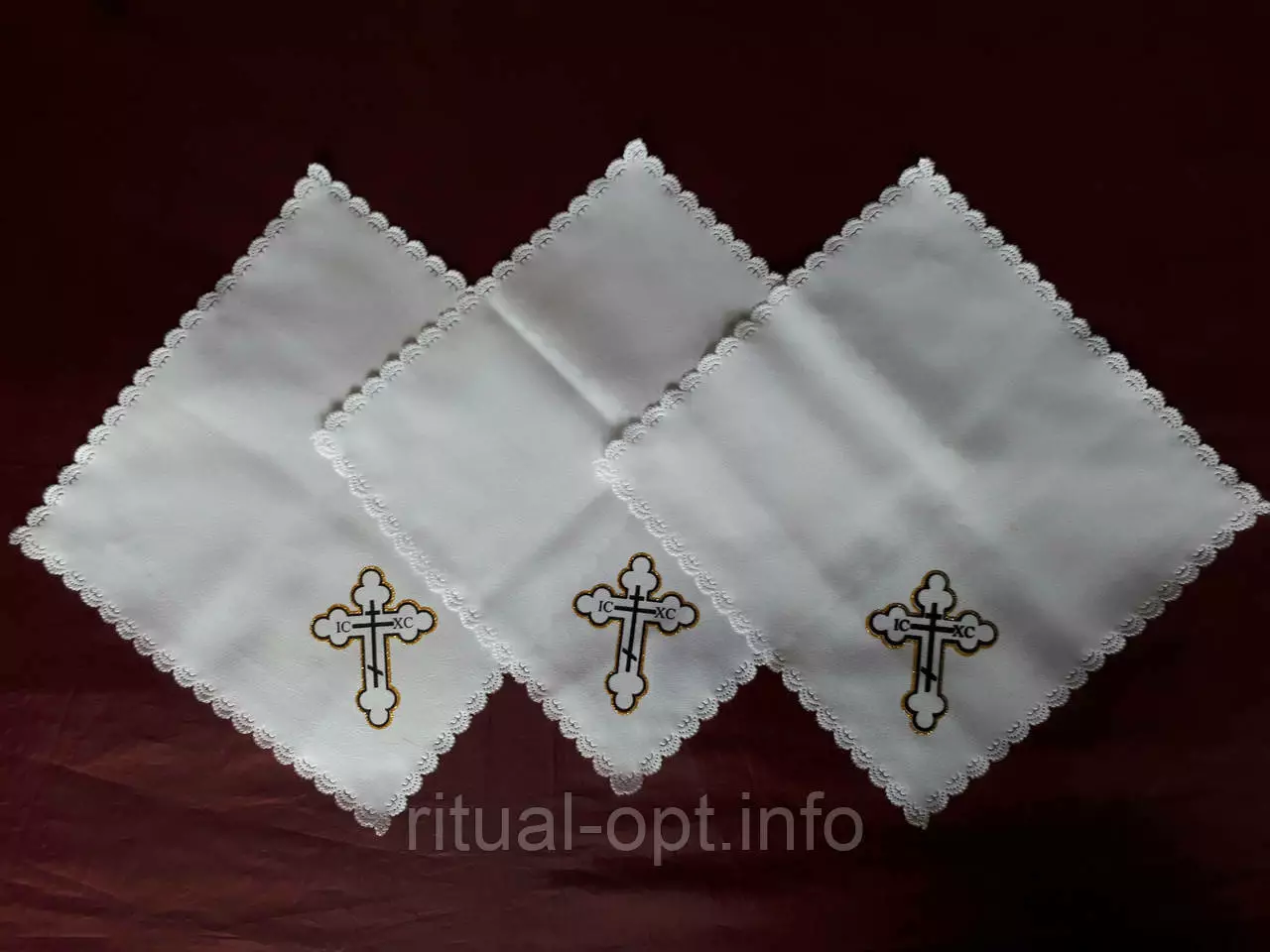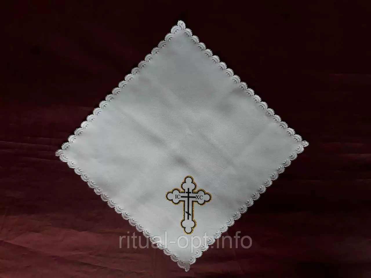 Матеріал габардин.Хустка білий з позолоченим хрестиком (якісний друк глітером).Розмір 22 25 .Виробник Україна.