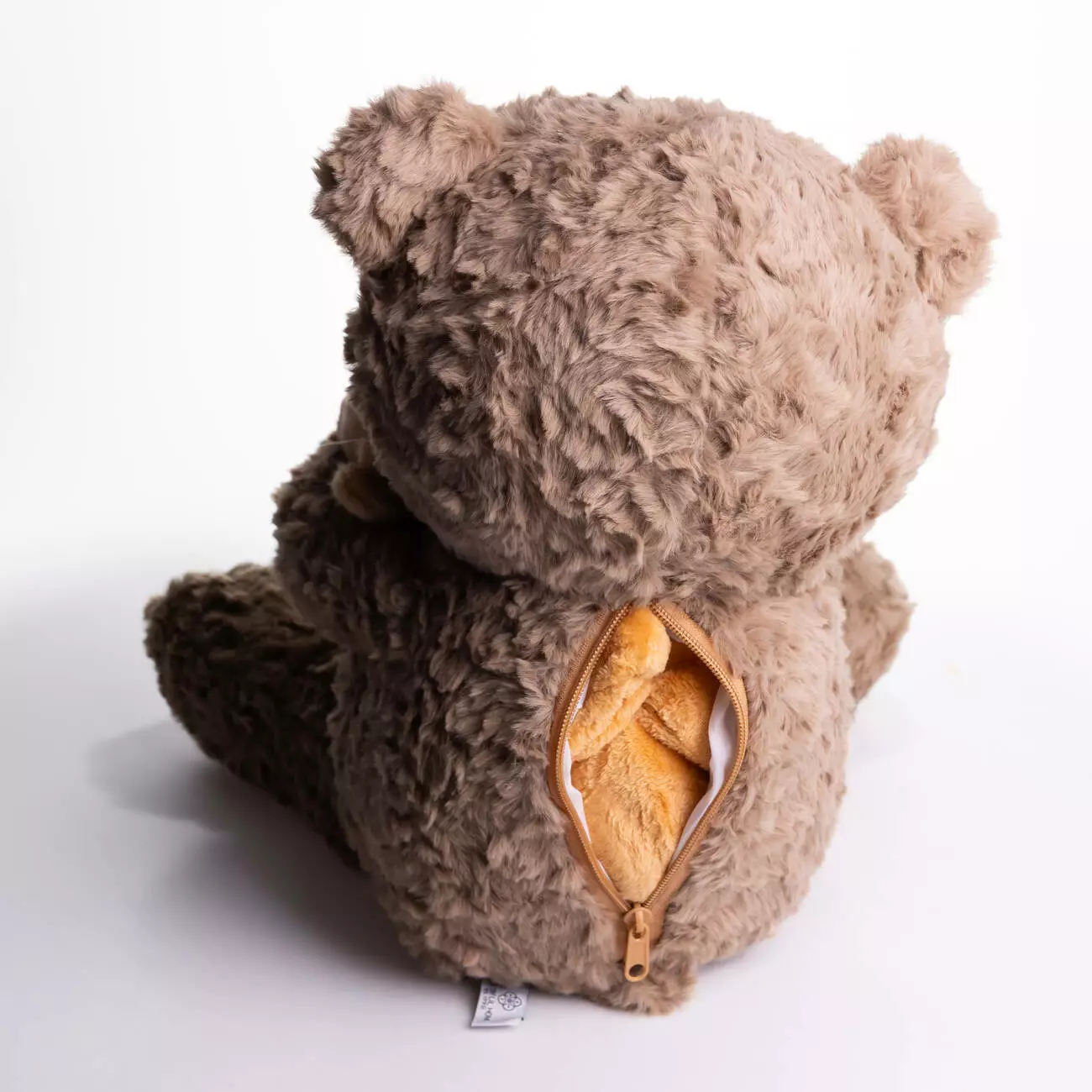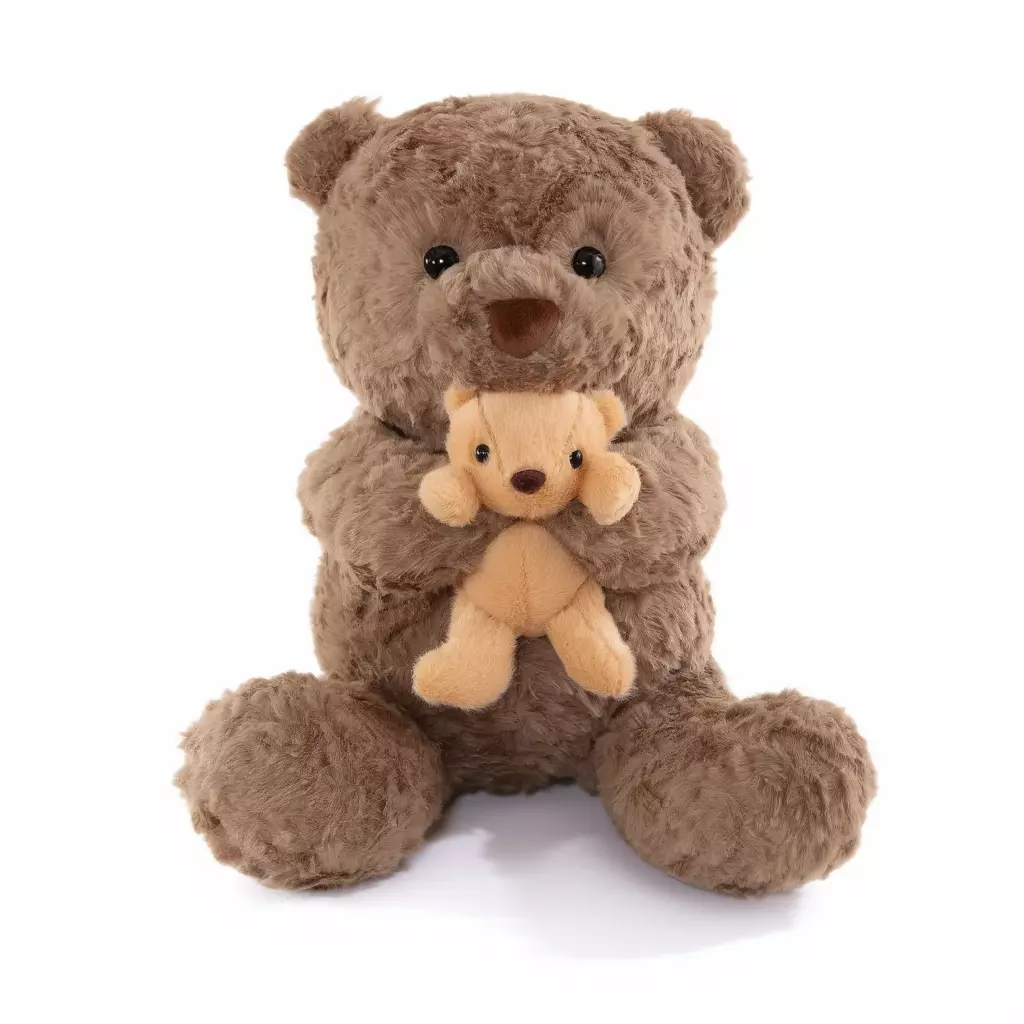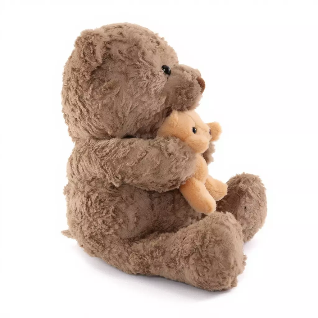 М’яка іграшка у вигляді ведмедика виконана з приємного на дотик плюшу. Ведмедик має округлу форму, акуратні вушка, маленькі чорні очі та темніший носик, що додає йому виразності та затишного вигляду. У лапках він тримає маленького ведмедика, що підкреслює декоративність виробу та робить його особливо привабливим для дитячої кімнати або подарунка.