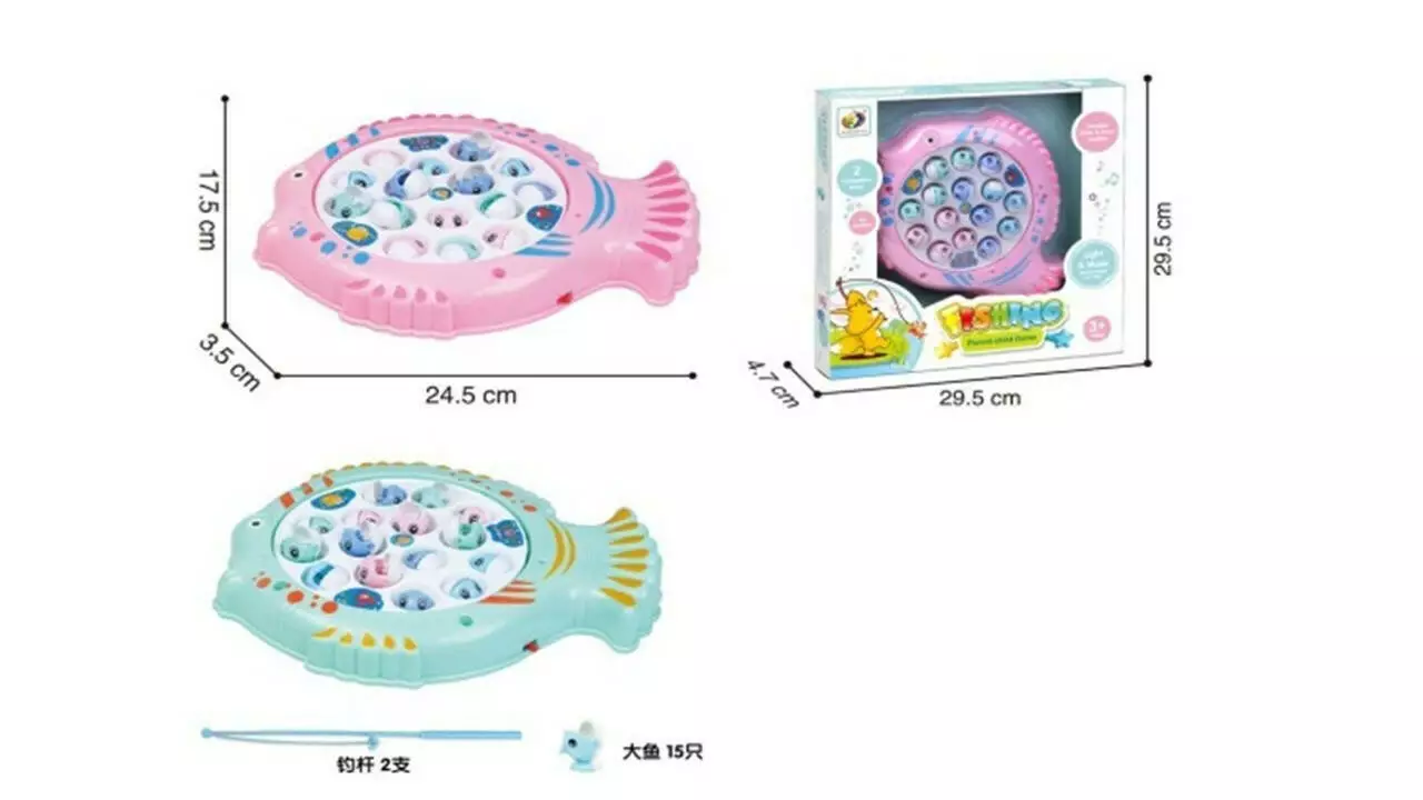 В наборе содержится 15 рыбок и две удочки.