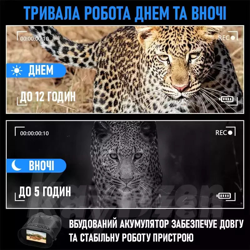 Благодаря выносливой батарее, бинокль обеспечивает до 5 часов беспрерывной работы ночью и впечатляющие 12 часов днем. Это позволяет вам не беспокоиться о перерывах в наблюдениях.