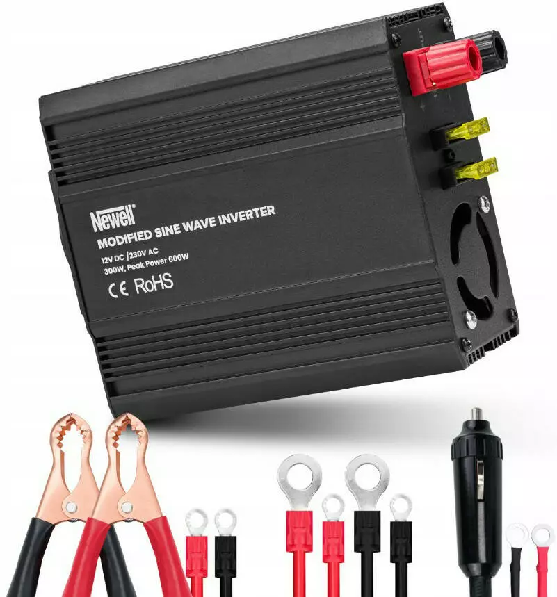 Инвертор напряжения Newell с модифицированной синусоидой - 12 В / 230 В, 300 Вт - идеальный выбор для тех, кто часто путешествует или хочет использовать свои любимые устройства там, где нет доступа к традиционным электрическим розеткам. Универсальным источником питания для него станет аккумулятор или автомобильный прикуриватель. Устройство оснащено 1 традиционной электрической розеткой (стандарт E) и 1 гнездом USB-A. К инвертору можно легко подключать такие устройства, как обогреватели, ноутбуки, смартфоны, планшеты и многое другое. Максимальная полезная мощность инвертора составляет 300 Вт. Помимо обычных кабелей и кабеля для гнезда прикуривателя, удобно использовать кабели с зажимами (хомутами), которые еще больше упростят подключение устройства к аккумуляторам.