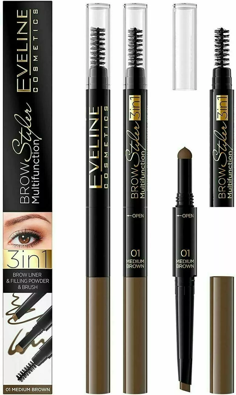 Карандаш для бровей еveline brow styler 3 в 1 многофункциональный, 01 medium brown, 1.2 г (5901761965841)