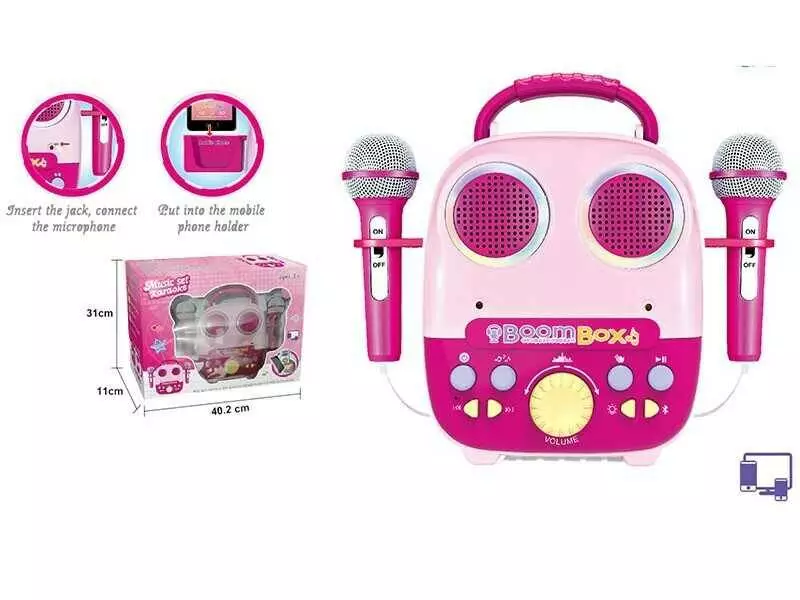 Home > Catalog > Toys > Toy musical instruments > Караоке 5040 (12) підсвічування, 2 мікрофони, 12 мелодій, підключення до телефону, тільки від мережі, регулювання гучності, USB-кабель, в коробці wholesale