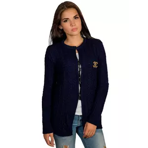 Стильный вязанный кардиган прямого силуэта, украшенный косами, выполнен из мягкой, приятной на ощупь пряжи. Модель с круглой горловиной. Спереди — застежка на крючки и оригинальная золотая брошка слева на груди. Отличный вариант для создания делового образа!