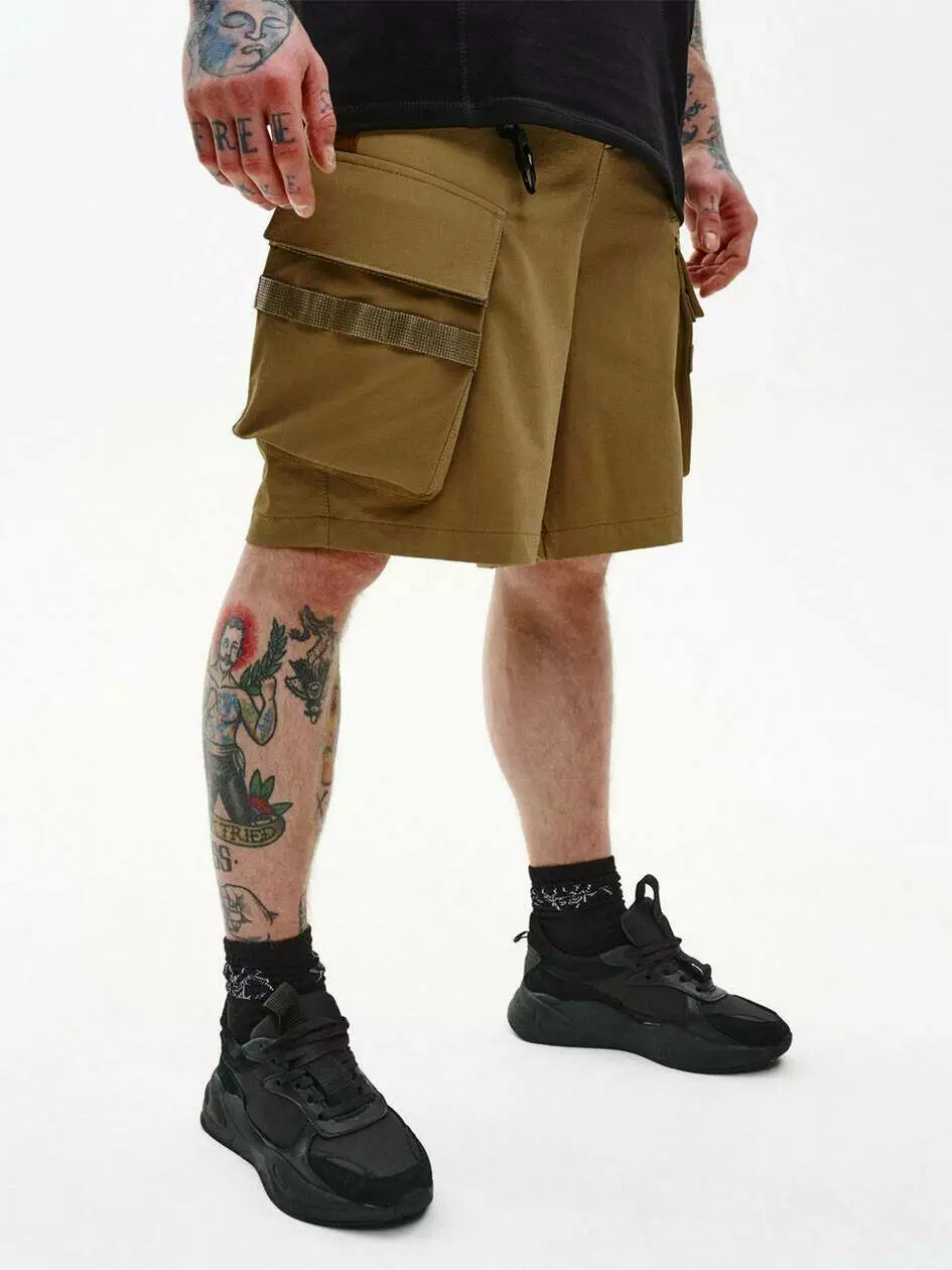 Карго-шорти з посиленим функціоналом та продуманою ергономікою. Мають 7 кишень: дві верхні, дві задні, дві бокові накладні з клапанами та одну з листочкою спереду зліва. Клапани застібаються на кнопки, розміщені на ремінних стрічках — для довговічності та зручного доступу.