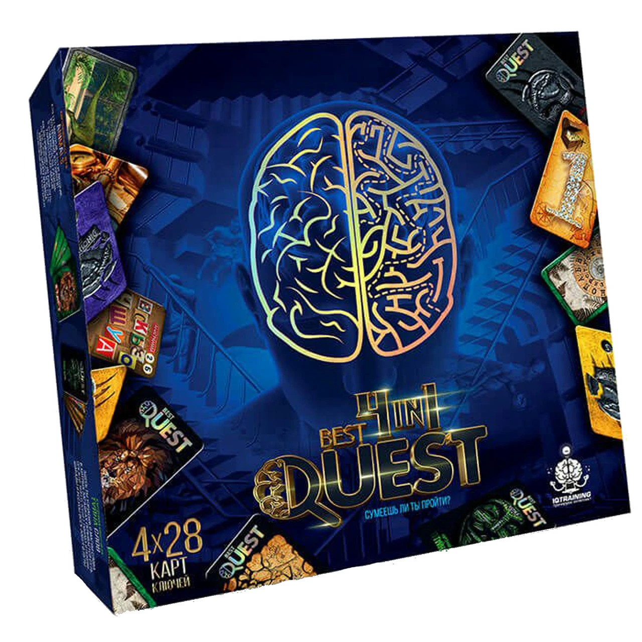 Мозг, как и мышцы, необходимо тренировать. Иначе он худеет и стареет . Сегодня во всём мире популярность квестов можно назвать настоящим Хит-бумом. Карточный вариант гарантирует не только весёлое времяпровождение, но и является инновационным, эффективным тренажером, который в игровой форме развивает креативное и логическое мышление, математические и аналитические способности, память и внимание. Набор 4 in 1 Best Quest Kimi - это 4 абсолютно разных, увлекательных квеста в одной коробке, лучший выбор для любителей загадок и головоломок. •Комплектация: • игровые карточки (4x28 шт.); • таблица для записей (4 шт.); • правила игры (1 шт).