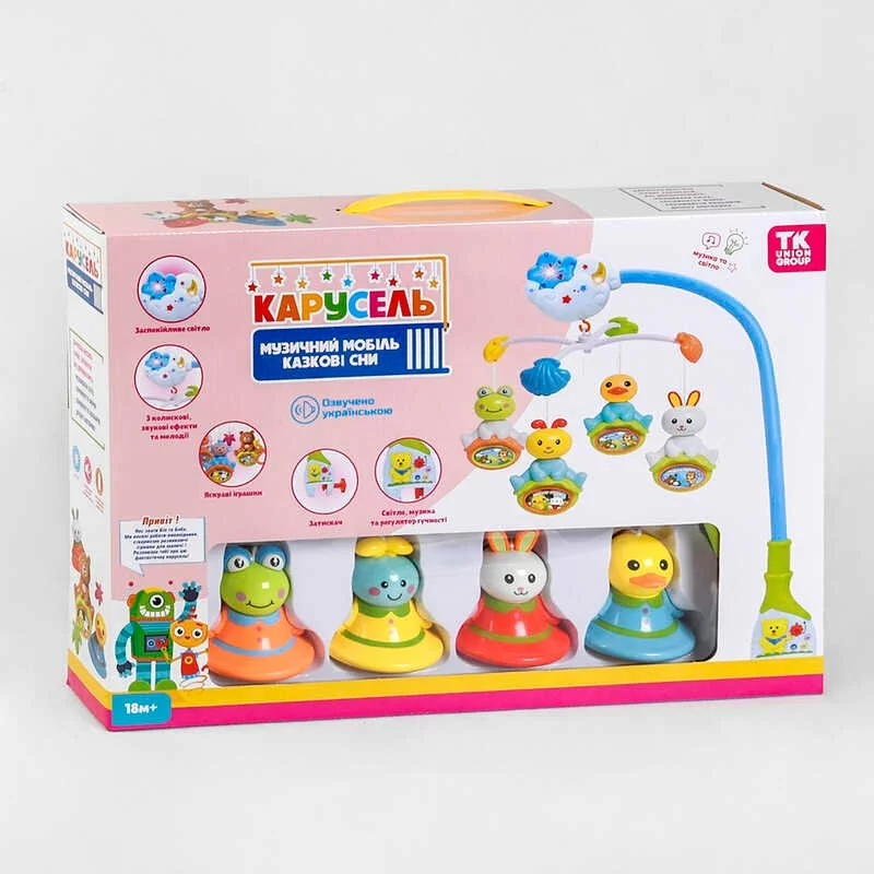 Карусель 29238 (18) ""TK Group"", ОЗВУЧУВАННЯ УКРАЇНСЬКОЮ МОВОЮ, 4 підвіски брязкальця, на ліжечко, обертання, підсвічування, 6 мелодій, в коробці