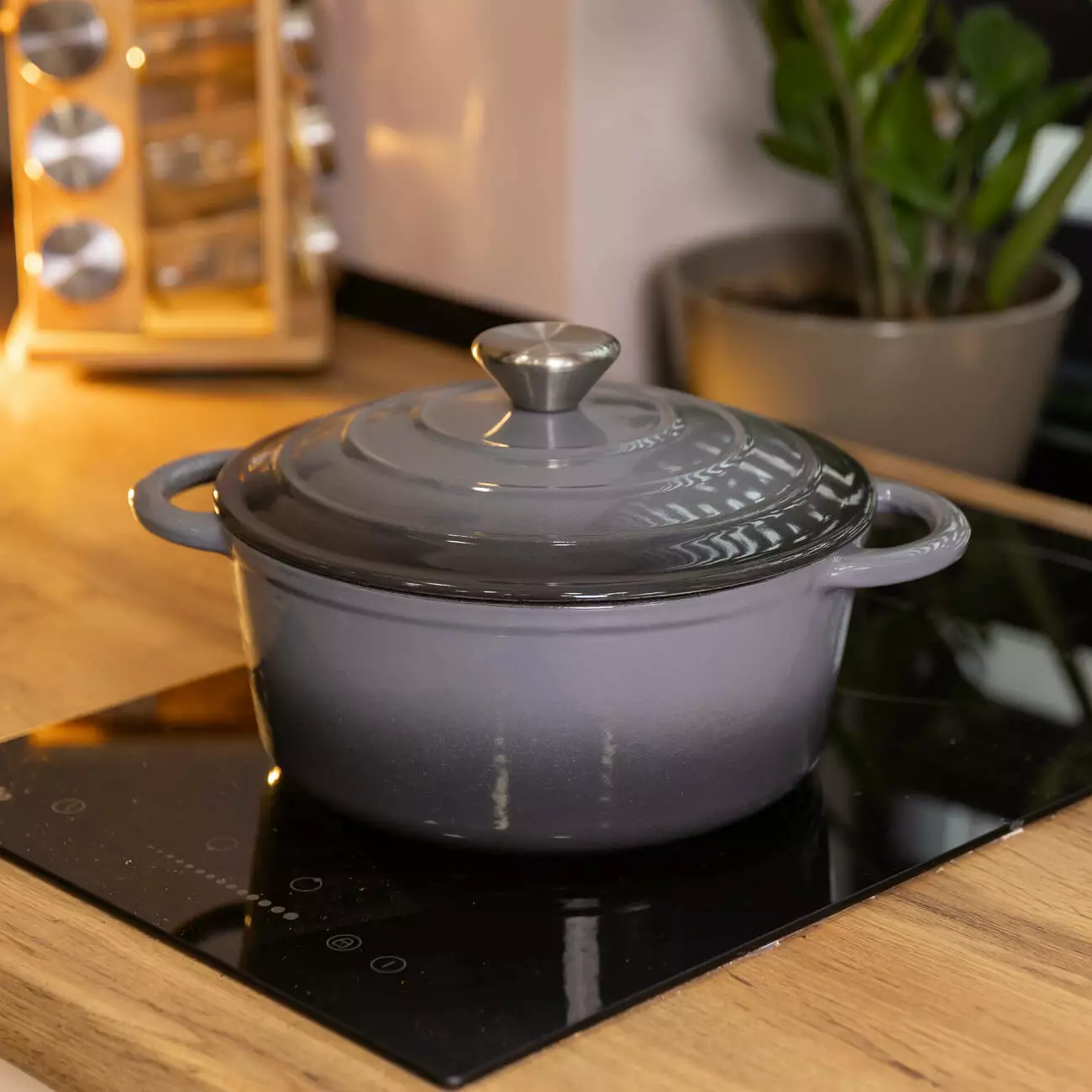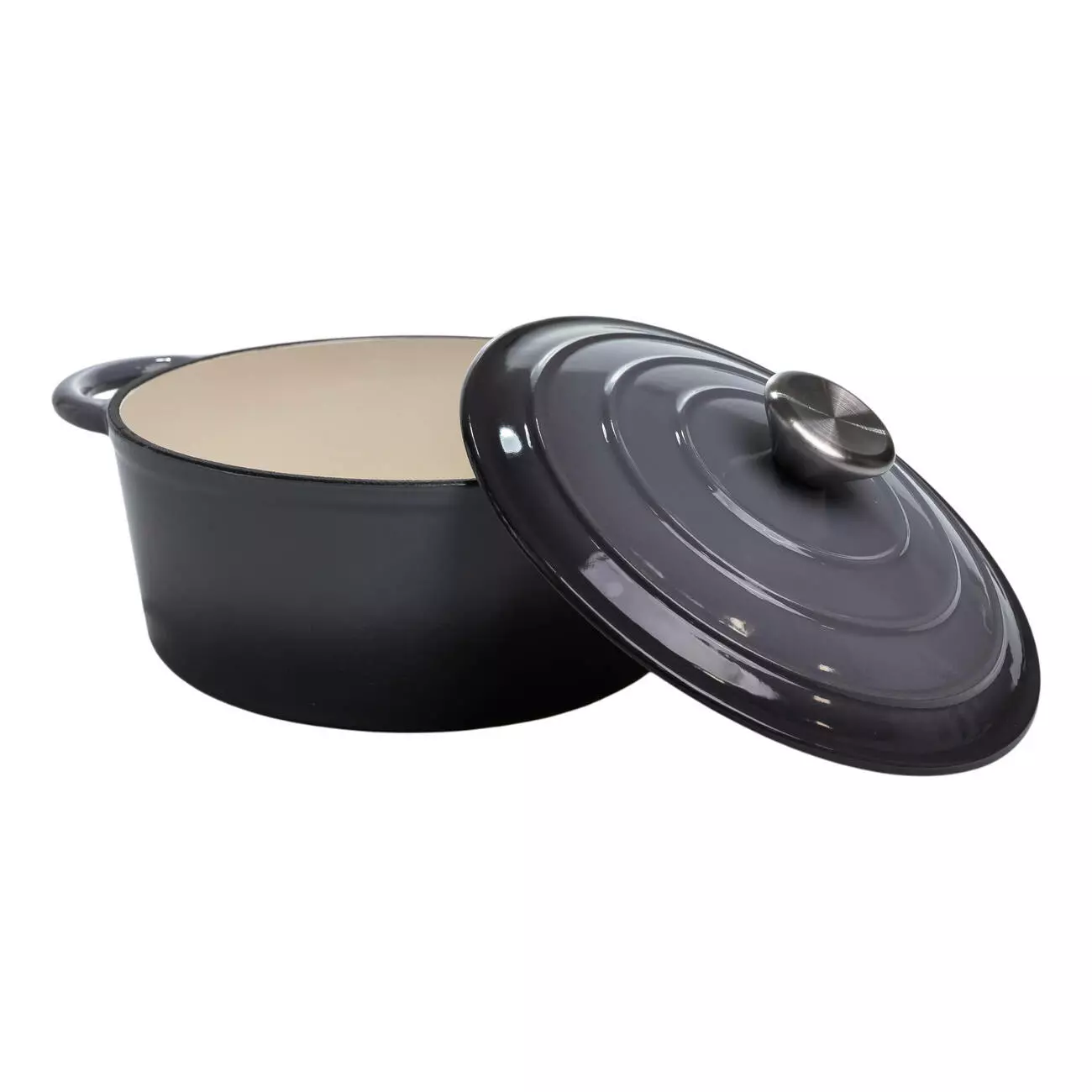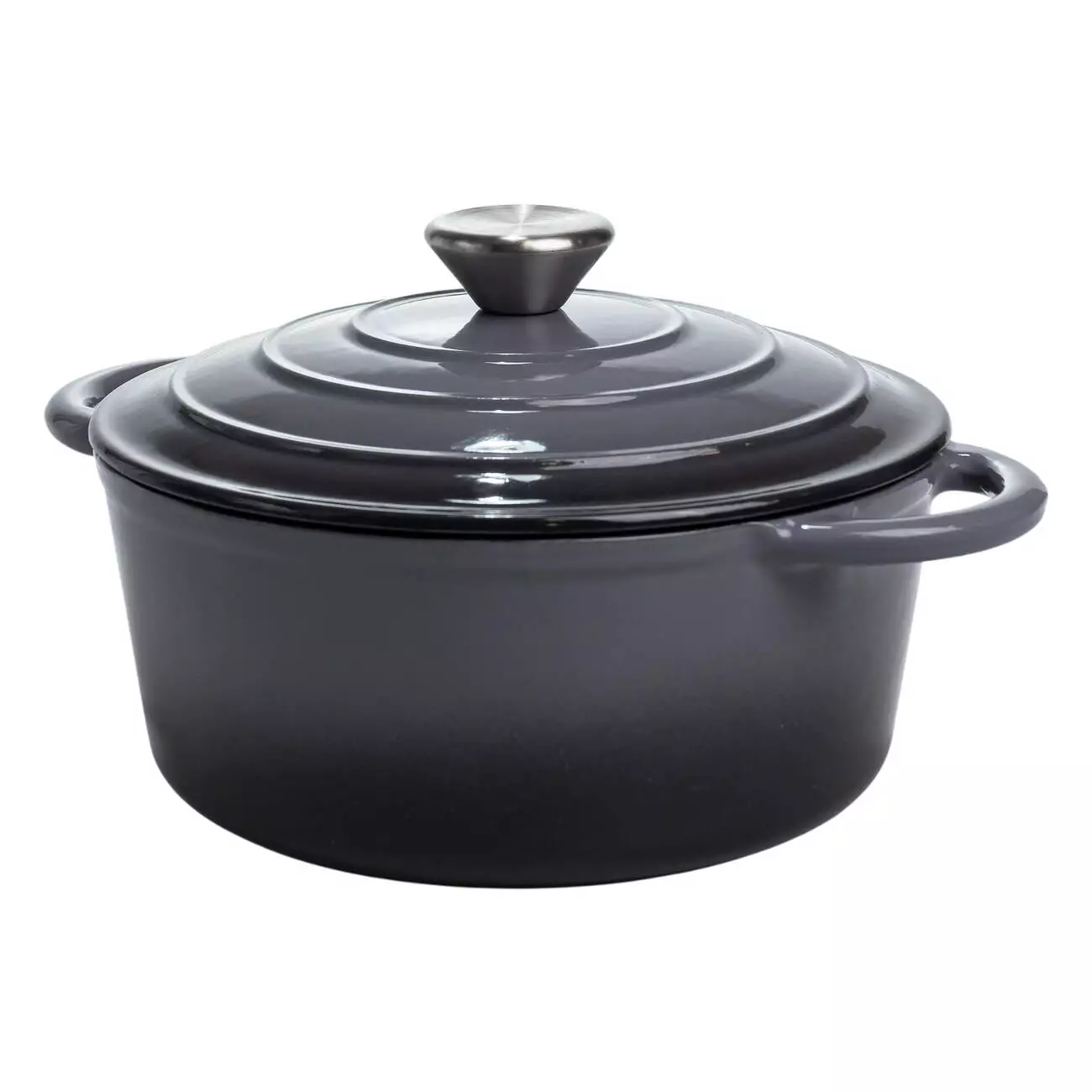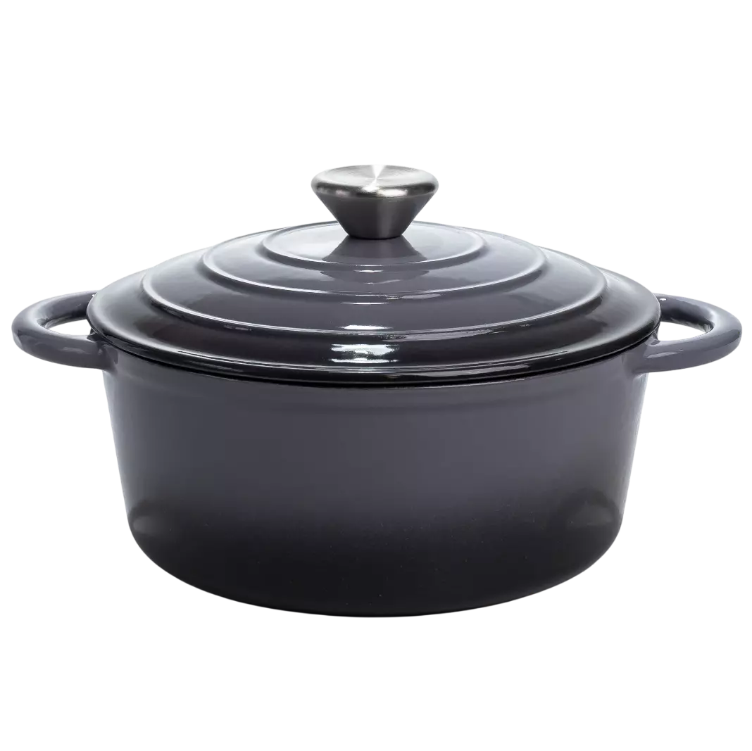 Чавунна каструля об'ємом 2,5 л з міцним емальованим покриттям та кришкою-куполом. Ідеальна для тушкування, запікання та повільного томління – зберігає рівномірне тепло та соковитість страв.
