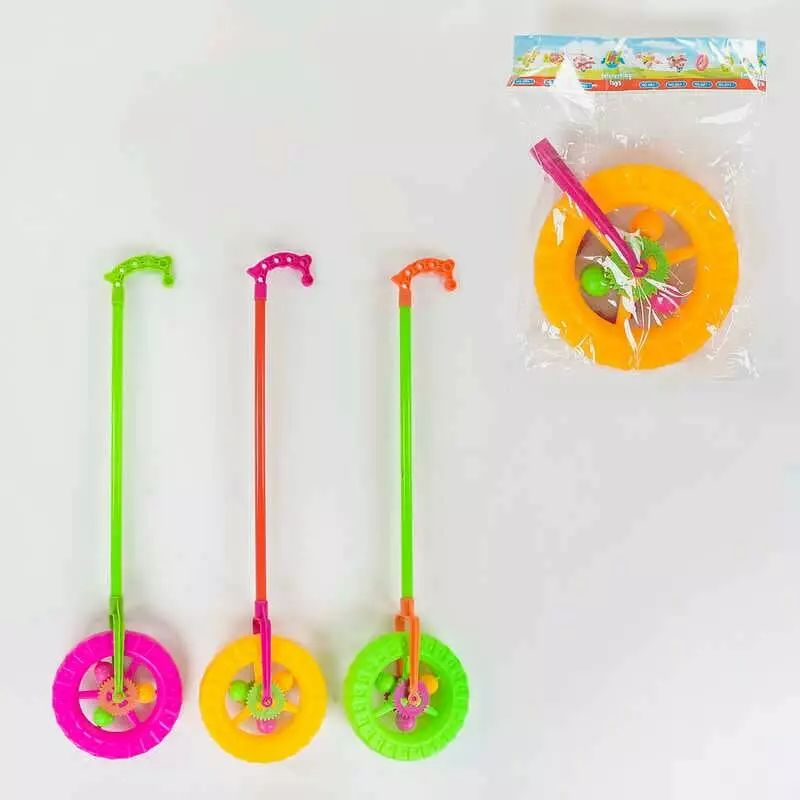 Каталка 909-1 (240/2) "Колесо", 3 види, з тріскачкою і брязкальцем на паличці, 3 кольори, 60см, в пакеті